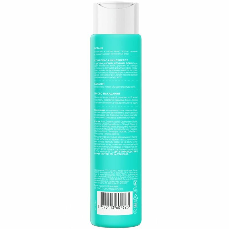 | Дополнительная информация | использовать после шампуня. Нанесите массирующими движениями на влажные волосы по всей длине на 2-3 минуты и тщательно смойте. Рекомендуем использовать с шампунем этой серии. |