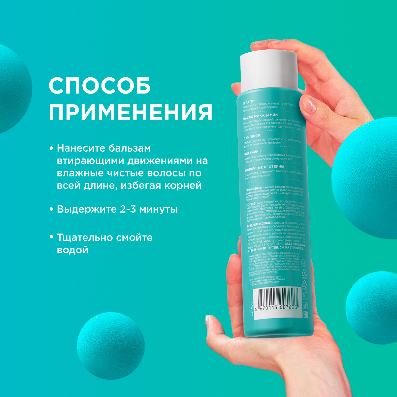 | Способ применения | Способ применения бальзама Использовать после шампуня. Нанесите массирующими движениями на влажные волосы по всей длине на 2-3 минуты и тщательно смойте. Рекомендуем использовать с шампунем этой серии. |