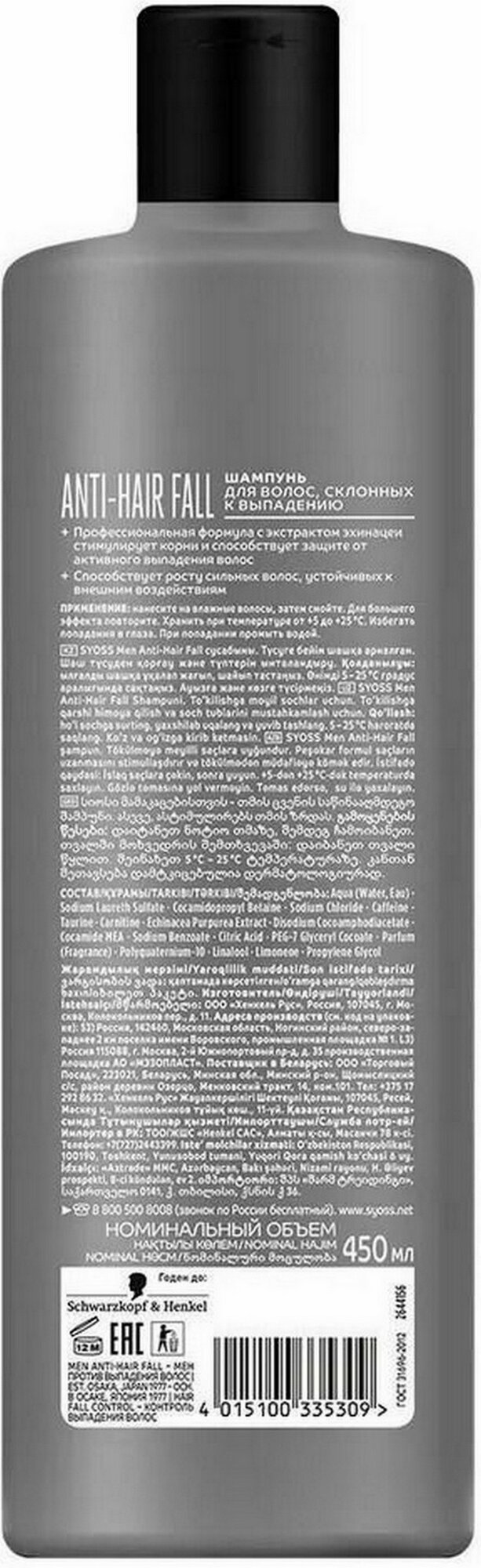 Купить Syoss Men Anti-Hair fall шампунь для мужчин для волос, склонных к выпадению 450 мл