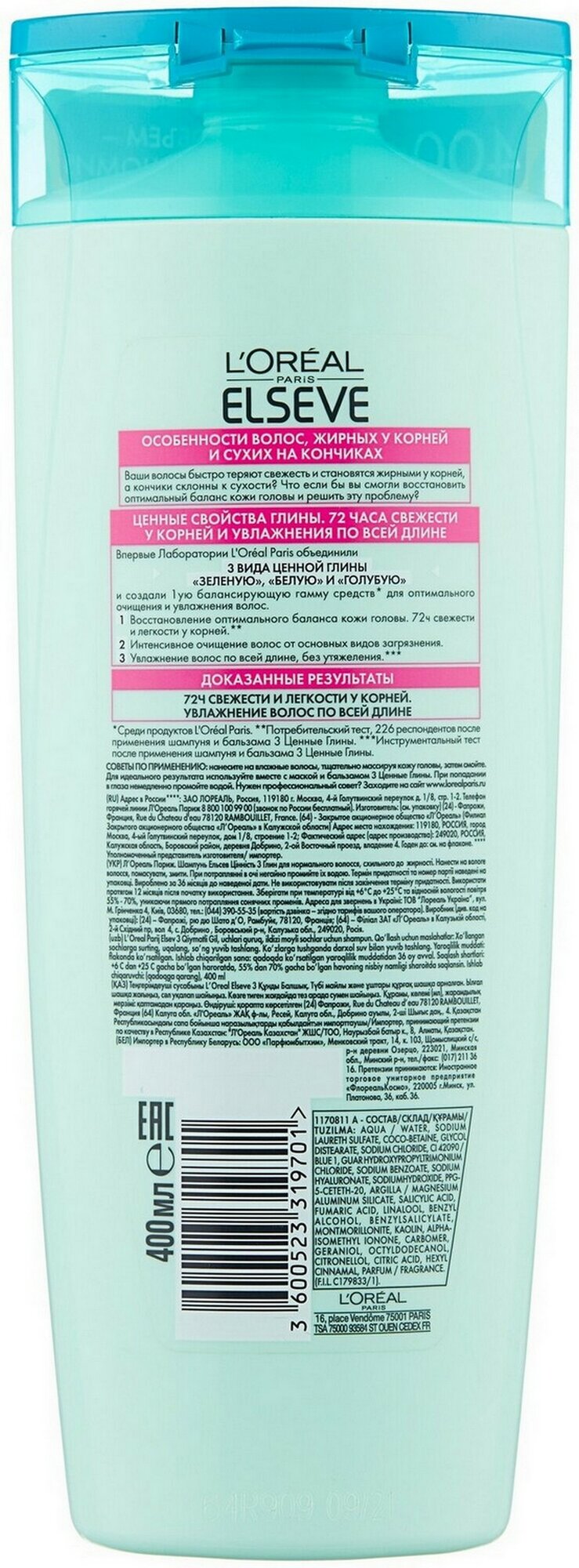 L'Oreal Paris Шампунь балансирующий Elseve "3 ценные глины" для волос, жирных у корней и сухих на кончиках, 400 мл, 3 шт.