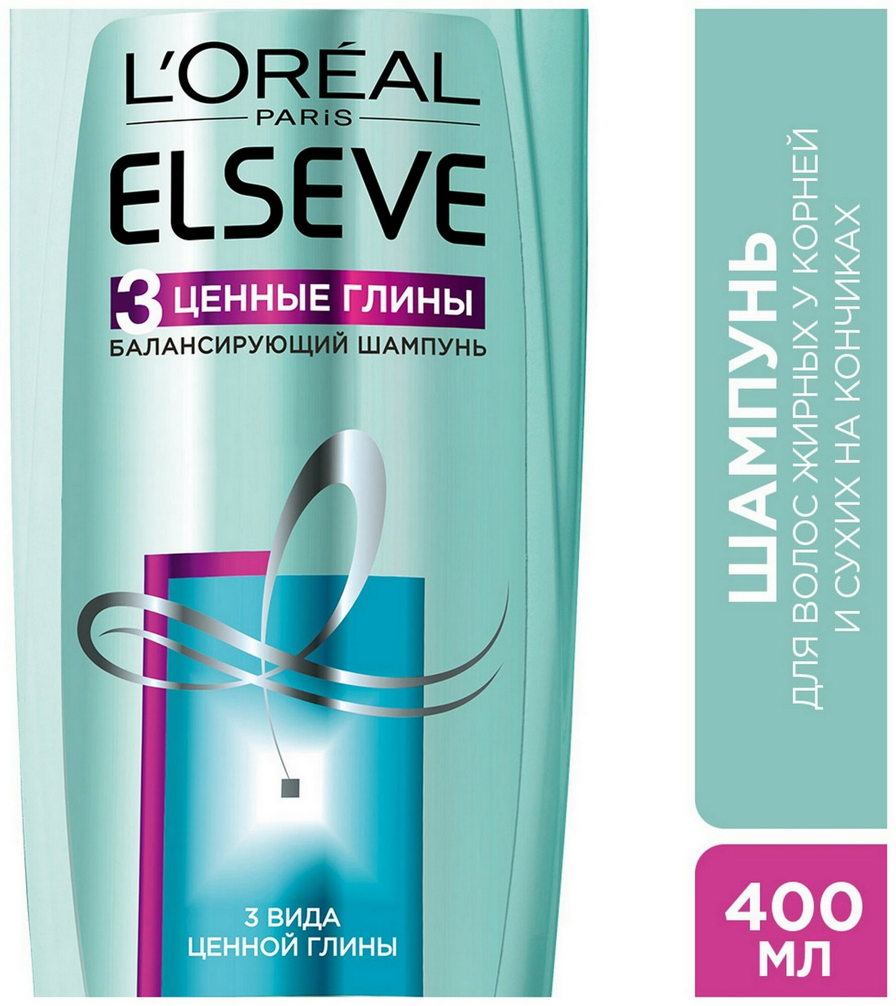 L'Oreal Paris Шампунь балансирующий Elseve "3 ценные глины" для волос, жирных у корней и сухих на кончиках, 400 мл, 2 шт.