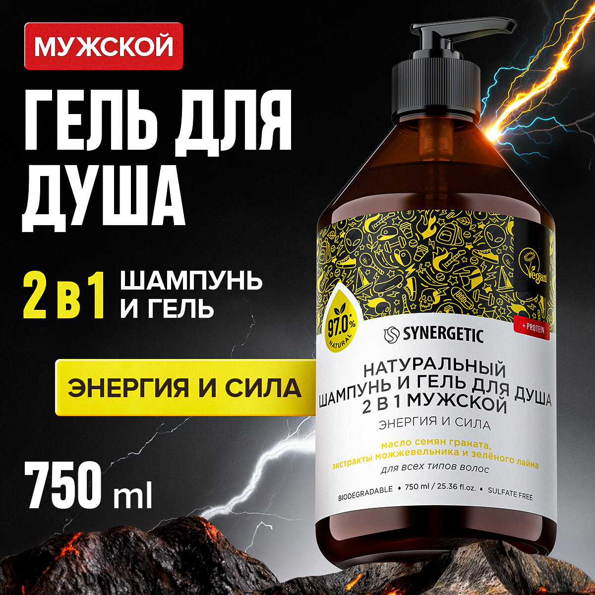 Купить Шампунь и гель для душа 2в1 SYNERGETIC для мужчин "Энергия и сила" натуральный, бессульфатный, 750мл
