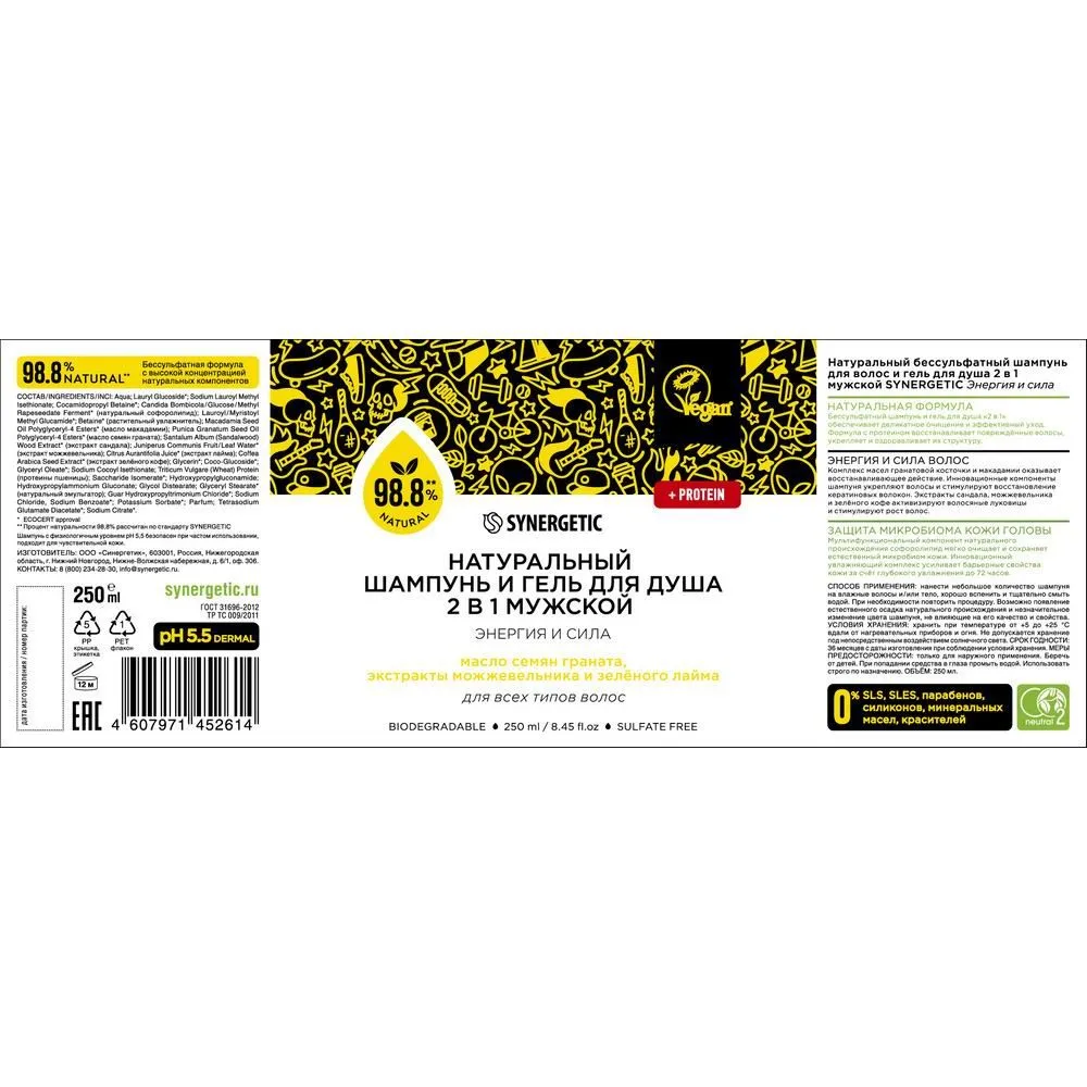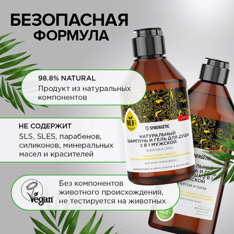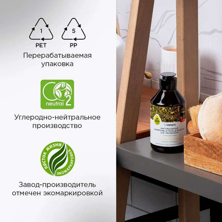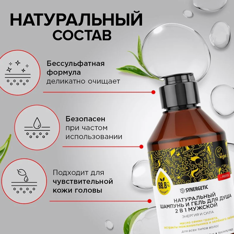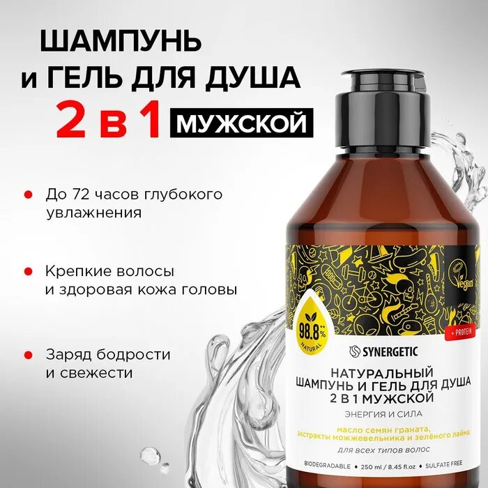 Synergetic Натуральный бессульфатный шампунь и гель для душа 2 в 1 мужской Энергия и сила 250 мл интересное: