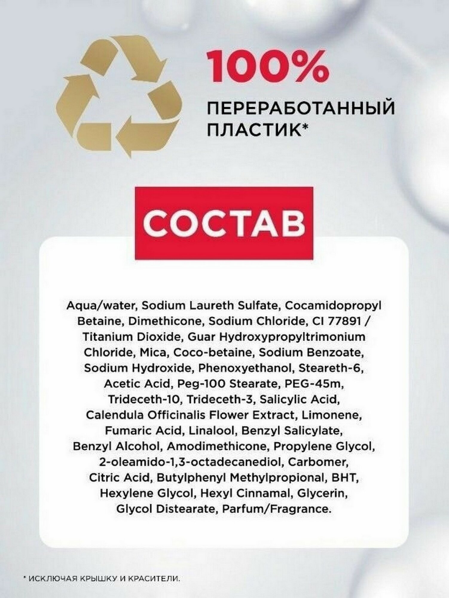 | Состав | aqua/water, sodium laureth sulfate, coco-betaine, dimethicone, glycol distearate, sodium chloride, guar hydroxypropyltrimonium chloride, sodium benzoate, hydroxypropyltrimonium hydrolyzed wheat protein, sodium hydroxide, ppg- 5-ceteth-20, arginine, salicylic acid, polyquaternium-7, limonene, linalool, benzyl salicylate, 2-oleamido-1,3- octadecanediol, carbomer, serine, butylphenyl methylpropional, citric acid, glutamic acid, hexyl cinnamal, glyceryl linoleate, glyceryl oleate, glyceryl linolenate, parfum/fragrance |