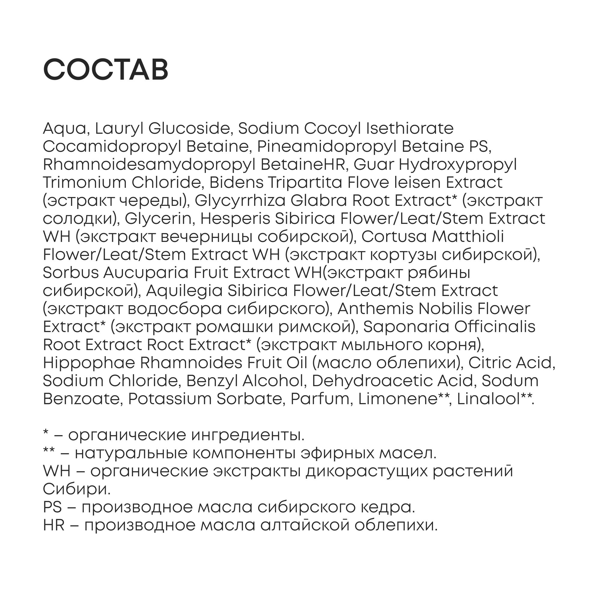 | Состав | Aqua, Lauryl Glucosid (производные глюкозы и кокосового масла) TEA Cocoyl Glutamate (из сахарного тростника), Cocamidopropyl Betaine (из кокосового масла), Decyl Glucoside (производное кокосового масла и глюкозы), Extracts: Bidens Tripartita (череда), Glycyrrhiza Glabra Fish (солодка уральская), Guar Hydroxopropyltrimonium Chloride (из гуаровой смолы), Cellulose Gum, Katon |