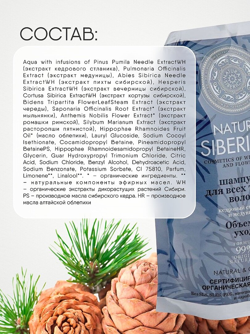 | Состав | aqua with infusions of pinus pumila needle extract (экстракт кедрового стланика), pulmonaria officinalis extract (экстракт медуницы), abies sibirica needle extract (экстракт пихты сибирской), hesperis sibirica extract (экстракт вечерницы сибирской), cortusa sibirica extract (экстракт кортузы сибирской), bidens tripartita flower/leaf/steam extract (экстракт череды), saponaria officinalis root extract (экстракт мыльнянки), anthemis nobiblis flower extract (экстракт ромашки римской), silybum marianium extract (экстракт расторопши пятнистой), hippophae rhamnodies fruit oil (масло облепихи), lauryl glucoside, sodium cocoyl isethionate, cocamydopropyl betaine, pineamidopropyl betaine, glycerin, guar hydroxypropyl trimonium chloride, citric acid, sodium chloride, benzyl alcohol, dehydroacetic acid, sodium benzonate, potassium sorbate, cl 75810, parfum, limonene, linalool |