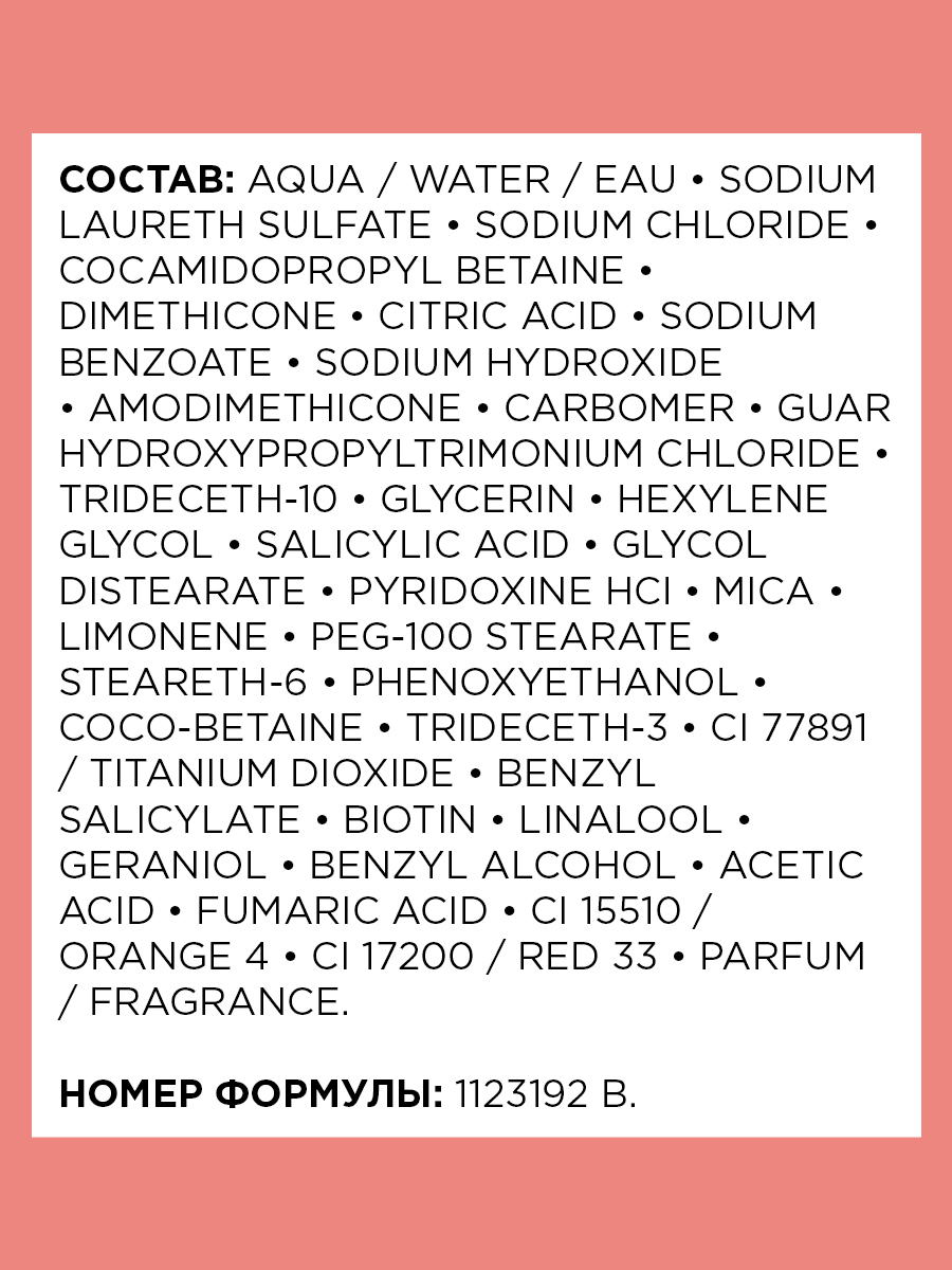 | Состав | aqua/water, sodium laureth sulfate, sodium chloride, cocamidopropyl betaine, dimethicone, sodium benzoate, amodimethicone, carbomer, guar hydroxypropyltrimonium chloride, trideceth-10, glycerin, hexylene glycol, salicylic acid, glycol distearate, pyridoxine hcl, citric acid, mica, limonene, peg-100 stearate, steareth-6, phenoxyethanol, coco-betaine, trideceth-3, ci 77891/titanium dioxide, peg-45m, benzyl salicylate, biotin, linalool, geraniol, benzyl alcohol, acetic acid, fumaric acid, ci 15510/orange 4, ci 17200/red 33, bht, sodium hydroxide, parfum/fragrance |