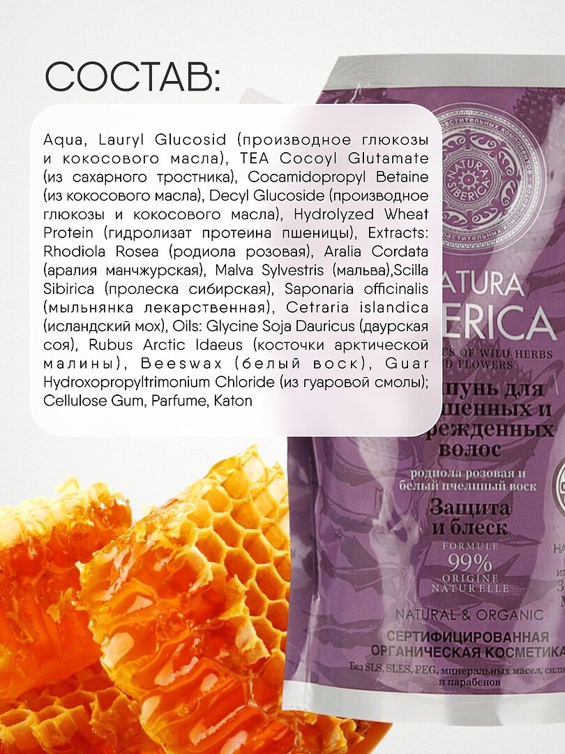 | Состав | aqua, rhodiola rosea root extract (экстракт родиолы розовой), cetraria nivalis extract (экстракт кладонии снежной), diplazium sibiricum extract (экстракт диплазиума сибирского), crepis sibirica extract (экстракт скерды сибирской), hydrolyzed wheat protein (протеин пшеницы), aralia mandshurica root extract (экстракт аралии маньчжурской), malva sylvestris extract (экстракт мальвы), saponaria officinalis root extract (экстракт мыльнянки), anthemis nobilis flower extract (экстракт ромашки римской), cera alba (пчелиный воск), glycine soja (soybean) oil , rubus idaeus fruit extract (экстракт малины), hippophae rhamnoides fruit oil (масло облепихи), sodium cocoyl isethionate, lauryl glucoside, cocamidopropyl betaine, pineamidopropyl betaine, glycerin, hippophae rhamnoidesamidopropyl betaine, guar hydroxypropyltrimonium chloride, citric acid, sodium chloride, benzyl alcohol, dehydroacetic acid, sodium benzoate, potassium sorbate, cl 75810, caramel, parfum, limonene, citral |