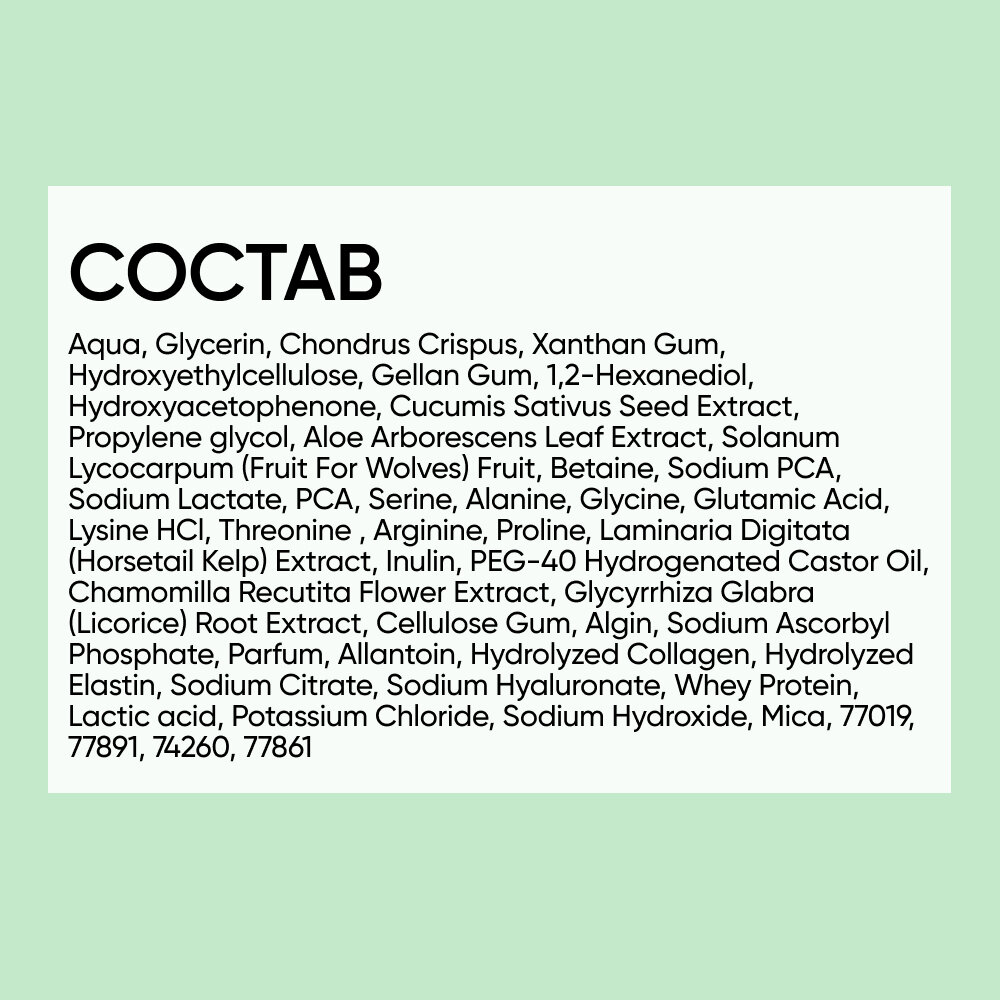 | Состав | Aqua, Glycerin, Chondrus Crispus, Cucumis Sativus Seed Extract, Solanum Lycocarpum (Fruit For Wolves) Fruit, Aloe Arborescens Leaf Extract, Laminaria Digitata (Horsetail Kelp) Extract, Chamomilla Recutita Flower Extract, Glycyrrhiza Glabra (Licorice) Root Extract, Inulin, Collagen Amino Acids, Allantoin, Sodium Hyaluronate, Whey Protein, PRODEW 600®, Cellulose Gum, Algin, Niacinamide, Sodium Ascorbyl Phosphate, Xanthan Gum, Hydroxyethylcellulose, Gellan Gum, Potassium Chloride, Sodium Citrate, Potassium Chloride, Germaben™ II, Eumulgin® CO 410, Parfume, Mica, Pigment Green 7, Mineral Pigments. |