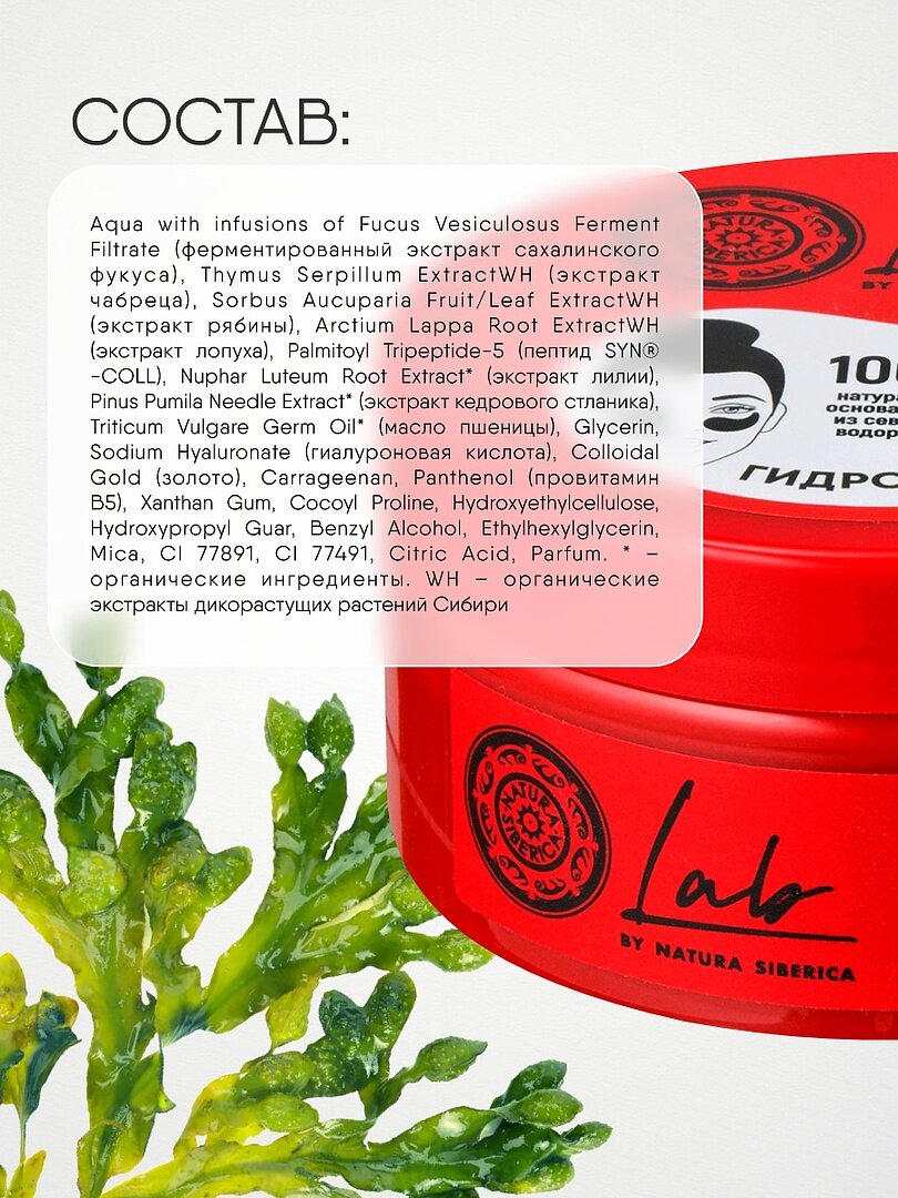 | Состав | aqua with infusions of Fucus Vesiculosus Ferment Filtrate (ферментированный экстракт сахалинского фукуса), Thymus Serpillum ExtractWH (экстракт чабреца), Sorbus Aucuparia Fruit/Leaf ExtractWH (экстракт рябины), Arctium Lappa Root ExtractWH (экстракт лопуха), Palmitoyl Tripeptide-5 (пептид SYN®-COLL), Nuphar Luteum Root Extract* (экстракт лилии), Pinus Pumila Needle Extract* (экстракт кедрового стланика), Triticum Vulgare Germ Oil* (масло пшеницы), Glycerin, Sodium Hyaluronate (гиалуроновая кислота), Colloidal Gold (золото), Carrageenan, Panthenol (провитамин В5), Xanthan Gum, Cocoyl Proline, Hydroxyethylcellulose, Hydroxypropyl Guar, Benzyl Alcohol, Ethylhexylglycerin, Mica, CI 77891, CI 77491, Citric Acid, Parfum |