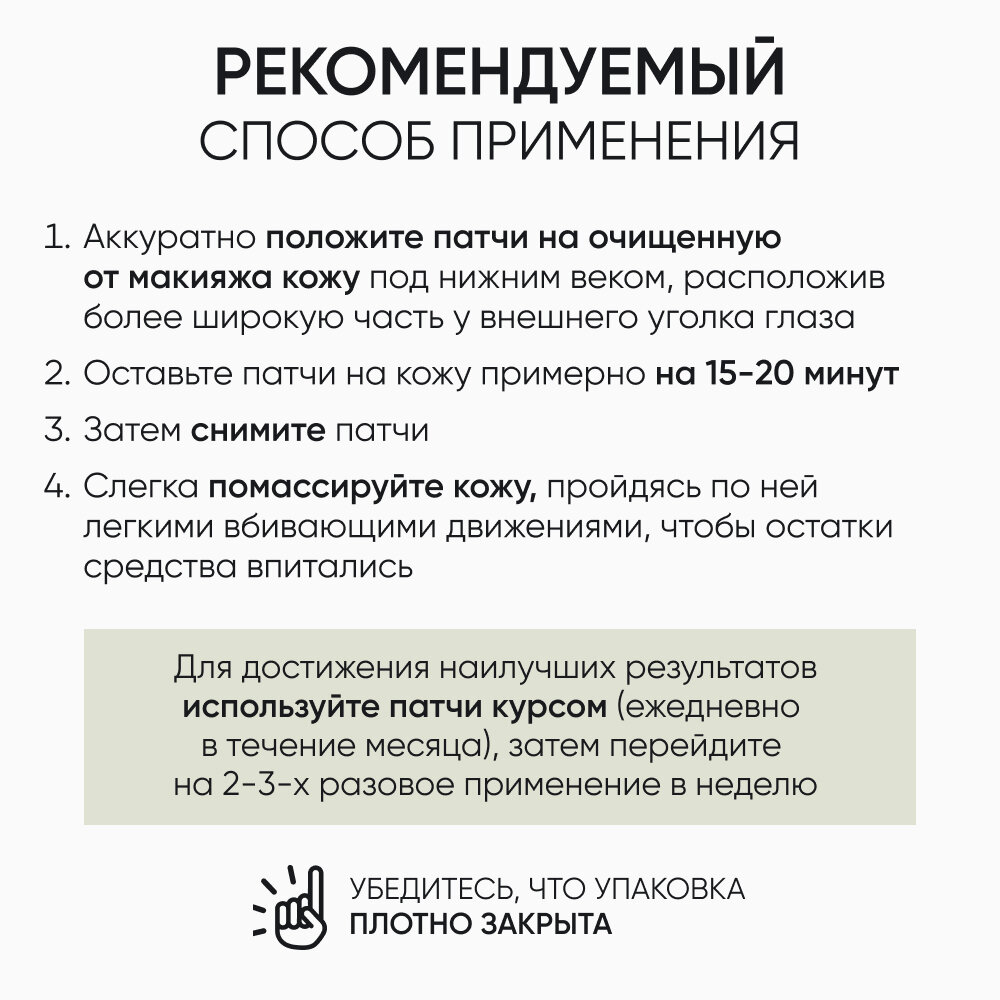 | Способ применения | Приложите патчи на предварительно очищенную кожу под глазами и/или на область носогубных складок. Патчи должны плотно прилегать к коже •через 15-20 минут снимите патчи. Похлопывающими движениями распределите оставшуюся эссенцию вокруг глаз и дайте впитаться. Для достижения наилучших результатов используйте патчи курсом (ежедневно в течение месяца), затем перейдите на 2-3х разовое применение в неделю.Убедитесь, что упаковка плотно закрыта. |