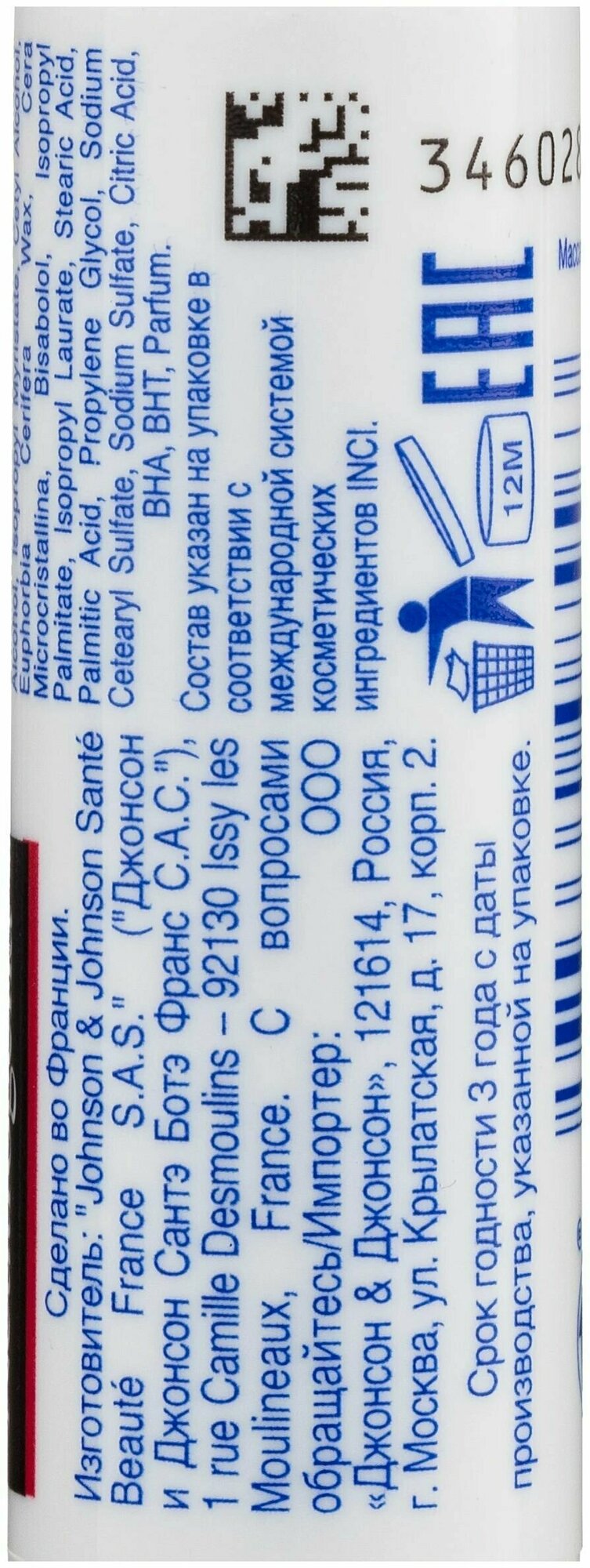 | Состав | Ricinus communis seed oil, caraffin, Cera alba, cetyl palmitate, ethylhexyl methoxycinnamate, cetearyl alcohol, isopropyl myristate, cetyl alcohol, Euphorbia cerifera wax, cera microcristallina, bisabolol, isopropyl palmitate, isopropyl laurate, stearic acid, palmitic acid, propylene glycol, sodium cetearyl sulfate, sodium sulfate, citric acid, BHA, BHT, parfum. |