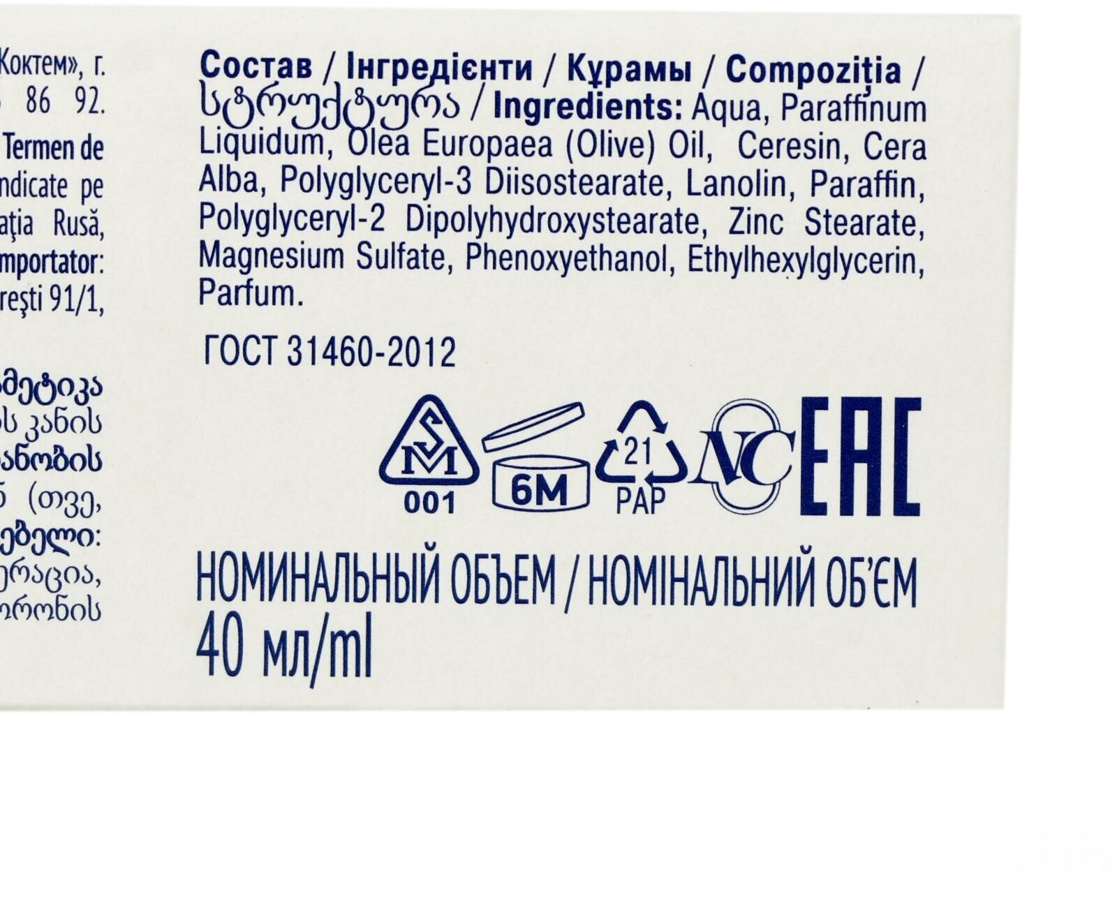 | Состав | Aqua, Paraffinum Liquidum , Olea Europaea (Olive) Oil, Ceresin, Cera Alba, Polyglyceryl-3 Diisostearate , Lanolin , Paraffin , Polyglyceryl-2 Dipolyhydroxystearate , Zinc Stearate , Magnesium Sulfate , Phenoxyethanol, Ethylhexylglycerin, Parfum. |