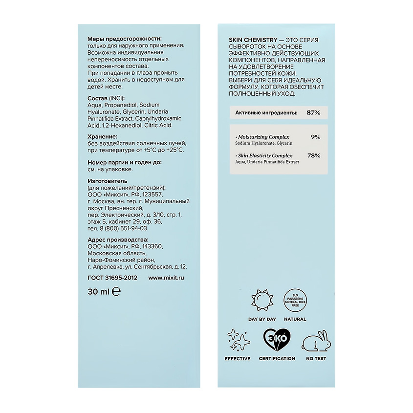 MIXIT Сыворотка для лица увлажняющая антивозрастная с гиалуроновой кислотой и коллагеном SKIN CHEMISTRY, 30 мл