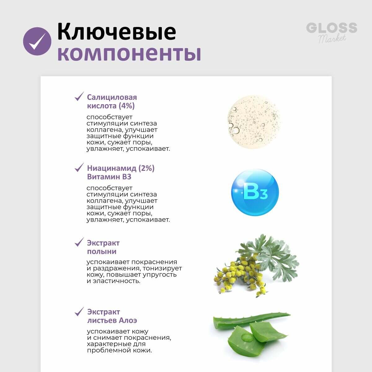 | Активный ингредиент | AHA-кислоты / ВНА-кислоты / азелаиновая кислота / аллантоин / витамин A (ретинол) / витамин B3 (ниацинамид) / витамины / гиалуроновая кислота / пантенол (провитамин B5) / пептиды / салициловая кислота / сок алоэ |