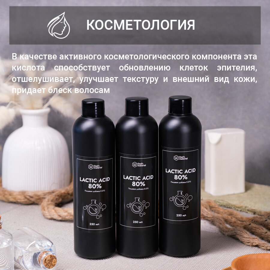 | Способ применения | Перед использованием необходимо встряхнуть бутылку средства, чтобы обеспечить равномерное распределение кислоты. Концентрация Объем воды на 1 мл 80% молочной кислоты рабочего раствора 0,5% 160 мл 1% 80мл 3% 25 мл 5% 15 мл 10% 7 мл 20% 4 мл 30% 2,5 мл Тоник 0,5 -1 % Пилинг для лица 5-10% Пилинг для тела 10-30% Гладкие пяточки 10-30% Для проведения пилинга лица и тела с помощью молочной кислоты, необходимо нанести на кожу лица пенку из средства, которое содержит молочную кислоту 80%. Пенка должна быть нанесена на кожу в течение 10-15 минут, после чего ее необходимо смыть водой. После процедуры необходимо использовать тоник для устранения красноты и регулятор pH. При использовании средства необходимо соблюдать меры безопасности и избегать контакта с глазами. В случае попадания средства на кожу или в глаза, необходимо немедленно промыть их водой. |