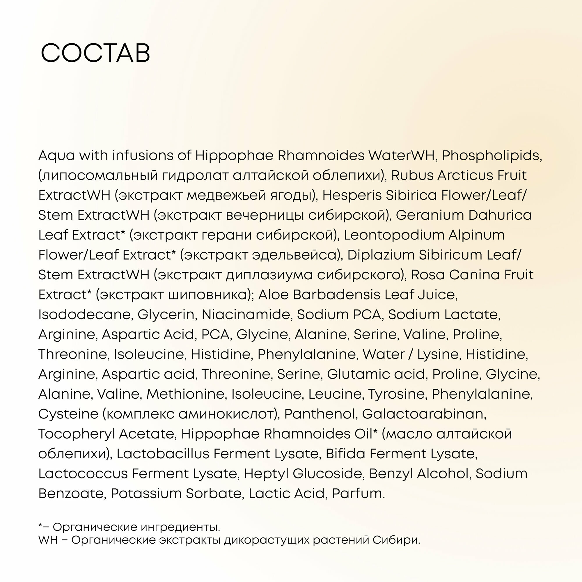 | Состав | Aqua with infusions of Hippophae Rhamnoides WaterWH, Phospholipids, (липосомальный гидролат алтайской облепихи), Rubus Arcticus Fruit ExtractWH (экстракт медвежьей ягоды), Hesperis Sibirica Flower/Leaf/Stem ExtractWH (экстракт вечерницы сибирской), Geranium Dahurica Leaf Extract (экстракт герани сибирской), Leontopodium Alpinum Flower/Leaf Extract (экстракт эдельвейса), Diplazium Sibiricum Leaf/Stem ExtractWH (экстракт диплазиума сибирского), Rosa Canina Fruit Extract (экстракт шиповника) |