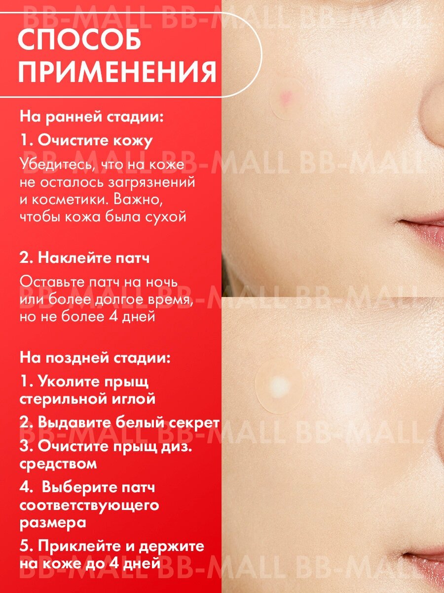 | Способ применения | выберите патч по размеру и нанесите прямо на акне. Оставьте на 8-12 часов на лице. Можно использовать как в дневное, так и в ночное время |