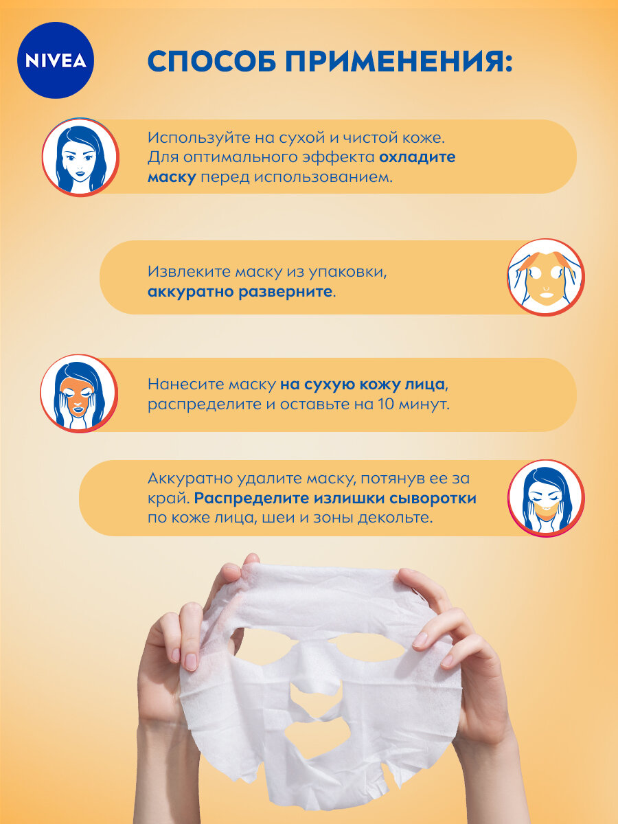 | Способ применения | используйте на сухой и чистой коже. Для оптимального эффекта охладите маску перед использованием. Извлеките маску из упаковки, аккуратно разверните. Нанесите маску на сухую кожу лица, распределите и оставьте на 10 минут. Не наносите на раздраженную или поврежденную кожу. Избегайте попадания в глаза. Аккуратно удалите маску, потянув ее за край. Распределите излишки сыворотки по коже лица, шеи и зоны декольте. Не требует смывания |