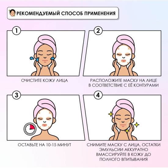 | Способ применения | используйте на предварительно очищенную кожу. Достаньте маску из упаковки и разверните. Наложите маску на лицо и равномерно распределите. При необходимости немного растяните маску в области глаз. Рекоммендованное время процедуры 5-10 минут. После окончания процедуры остатки лосьона мягко распределите по зоне лица, шеи и декольте. Не смывайте. Для ухода за сухими участками тела - после использования маски на лице сложите ее и проведите маской по всему телу |
