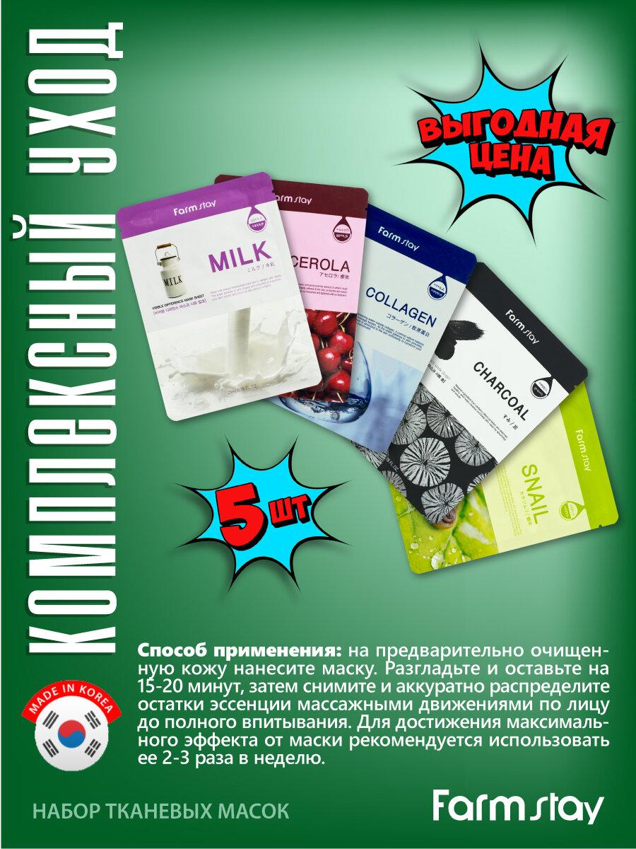 Купить FarmStay м Подарочный набор тканевых масок для ухода за кожей лица : "Комплексный уход", корейская косметика. 5 шт