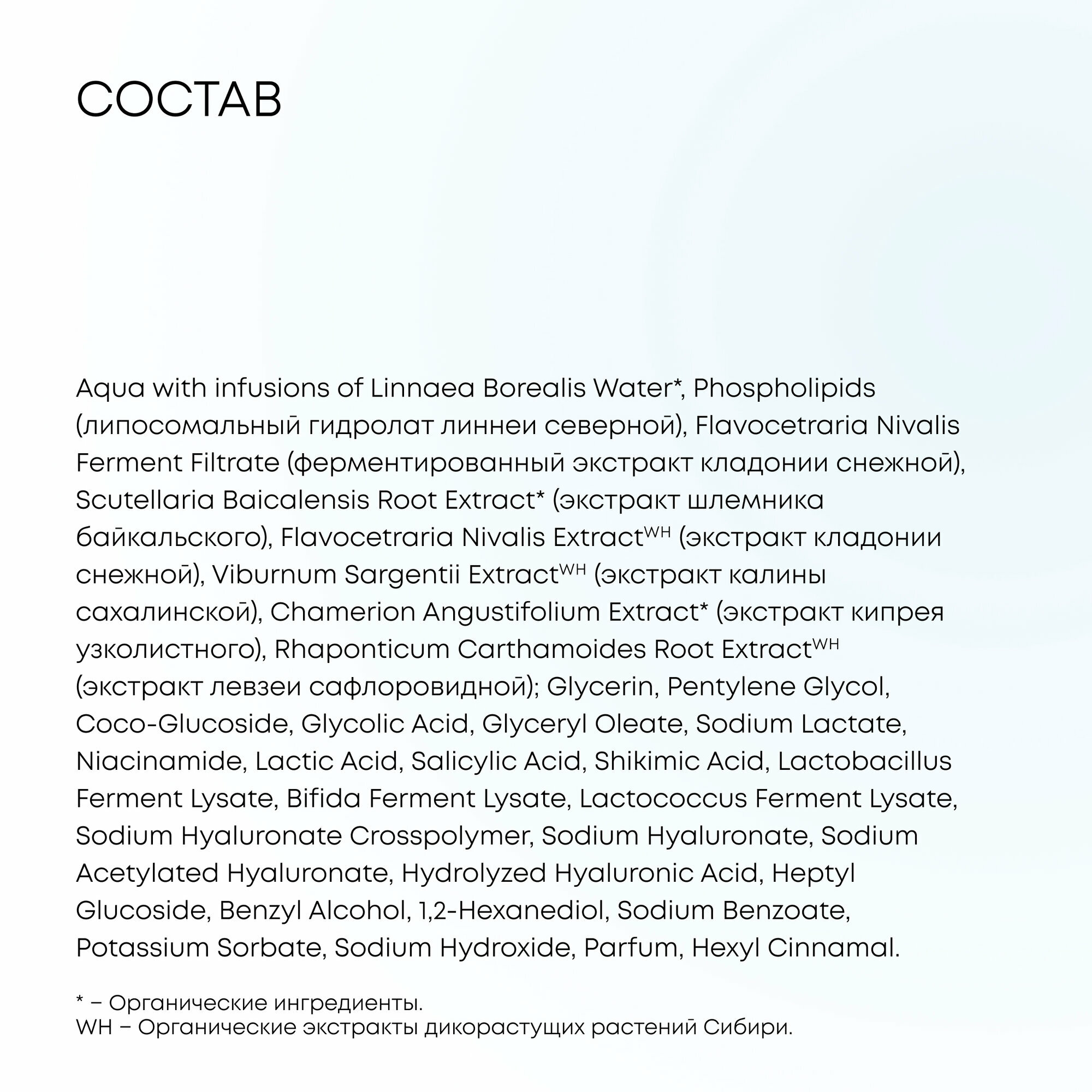 | Активный ингредиент | AHA-кислоты / бифидобактерии / гиалуроновая кислота / гликолевая кислота / глицерин / лактобактерии / молочная кислота / ниацинамид / салициловая кислота / фруктовые кислоты |
