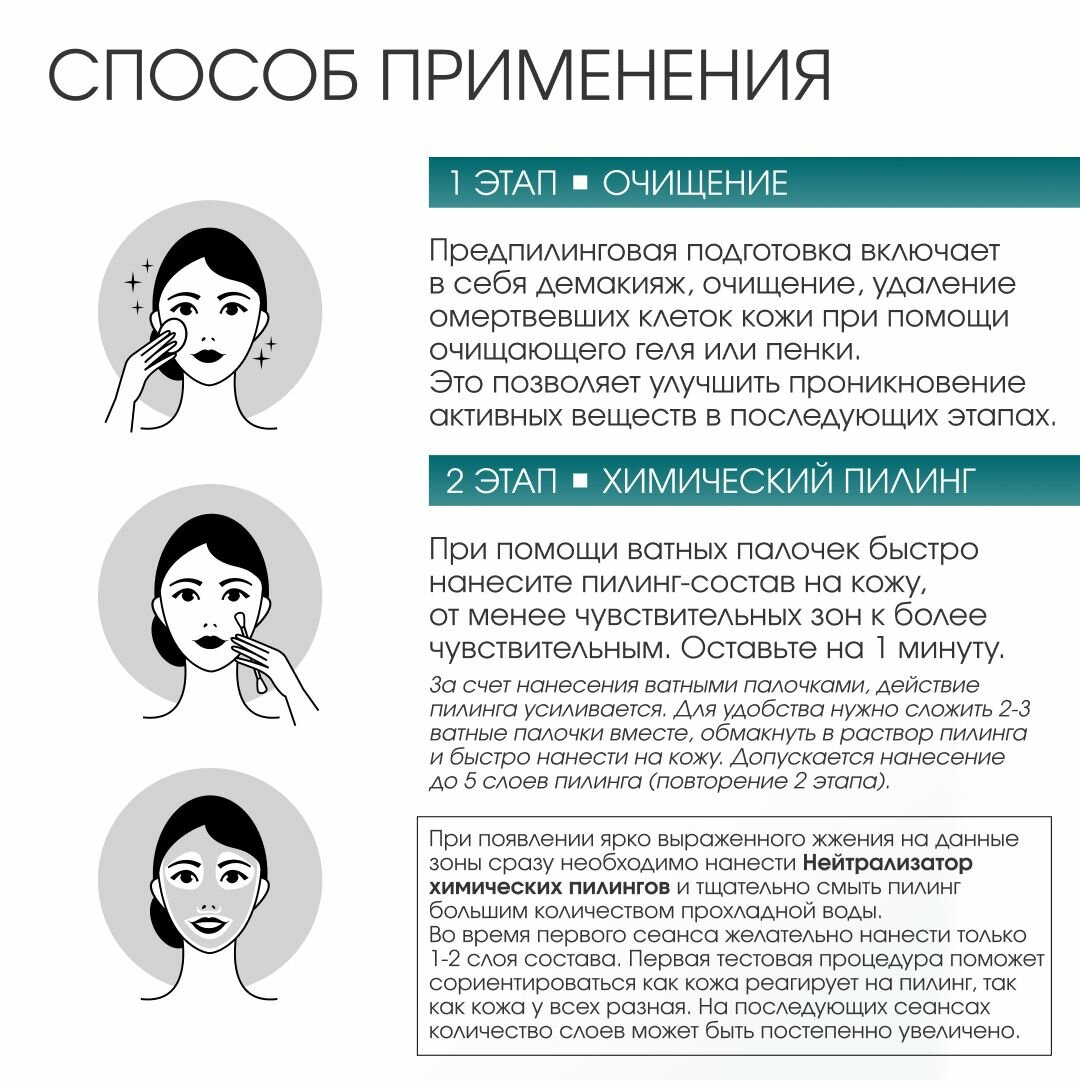 | Способ применения | Поверхностный (для тонкой кожи или неподготовленный к хим.пилингам) - на кожу наносят один слой. Серединно-поверхностный - наносят 2-3 слоя на более длительное время, Серединный- наносят 4-5 слоёв. Для прекращения действия обязательно наносится нейтрализатор, нанести нейтрализатор подождать 2-3 мин и смыть водой. после процедуры рекомендуется избегать прямых солнечных лучей и использовать солнцезащитный крем с фактором защиты не ниже 40% |