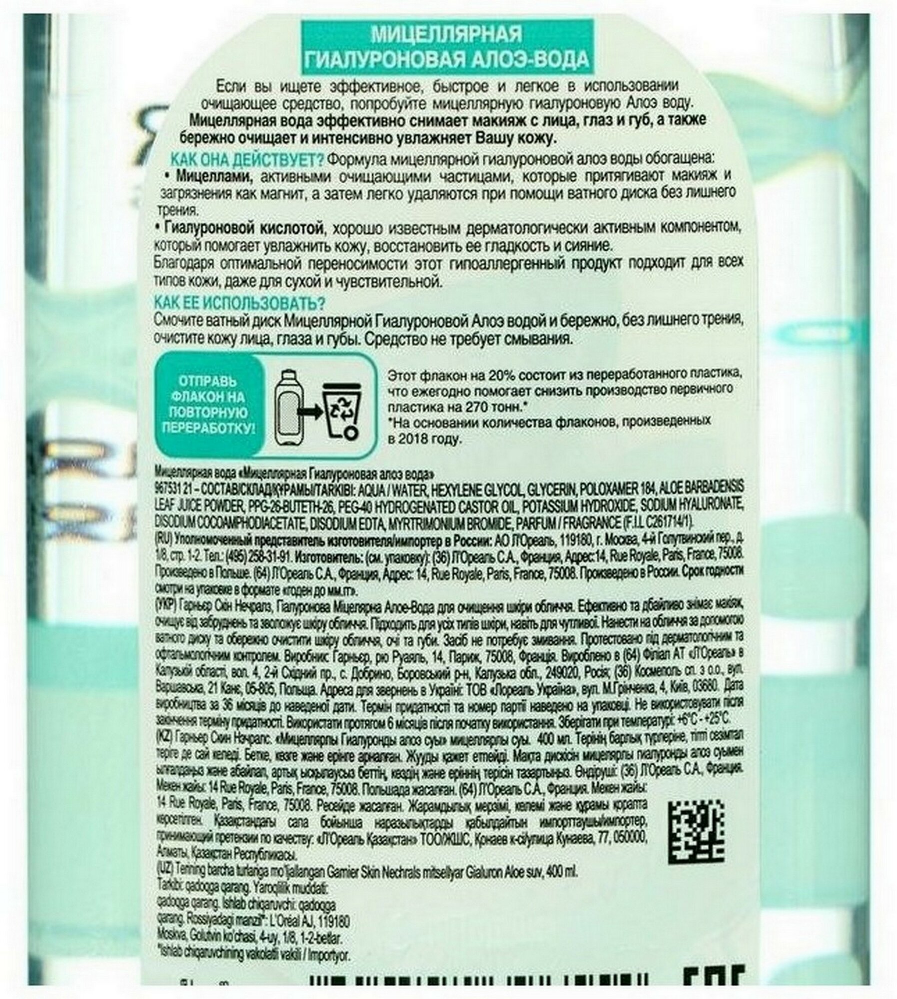| Состав | aqua / water, glycerin, poloxamer 184, aloe barbadensis, leaf juice powder, ppg-26-buteth-26, peg-40 hydrogenated castor oil, potassium hydroxide, sodium hyaluronate, disodium cocoamphodiacetate, disodium edta, myrtrimonium bromi, deparfum / fragrance |