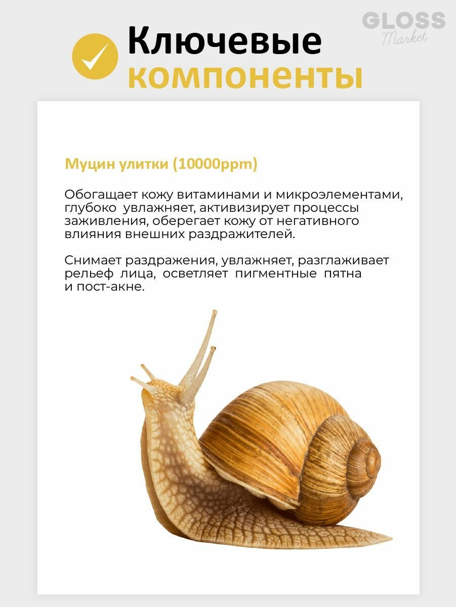 | Активный ингредиент | аллантоин / бетаин / витамины / лимонная кислота / муцин улитки / салициловая кислота / энзимы |