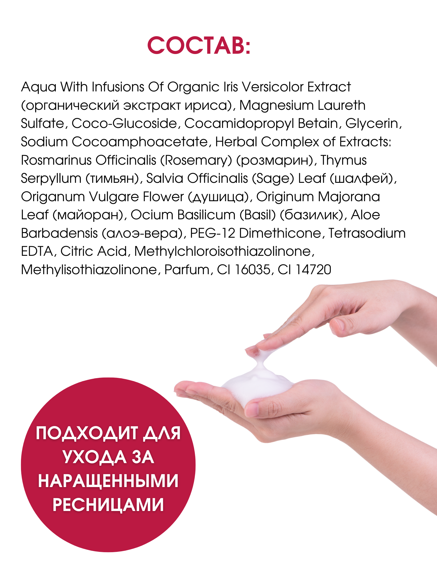 | Состав | Вода, глицерин, пантенол 6%, шалфей 3%, розмарин 3%, тимьян 3%, душица 3%, майоран 3%, базилик 3%, парфюмерная жидкость 6%. Полный состав: органический экстракт лаванды, лауретсульфат магния, кокосовый глюкозид, натуральный бетаин сахарной свеклы, кокамидопропилбетаин, глицерин, кокоамфоацетат натрия, растительный комплекс экстрактов: розмарин, тимьян, шалфей, душица, майоран, базилик; пантенол, диметикон ПЭГ-12, Тетразодий ЭДТА, лимонная кислота, метилхлоризотиазолинон, метилизотиазолинон, парфюмированная вода, Cl42090, Cl14720. |