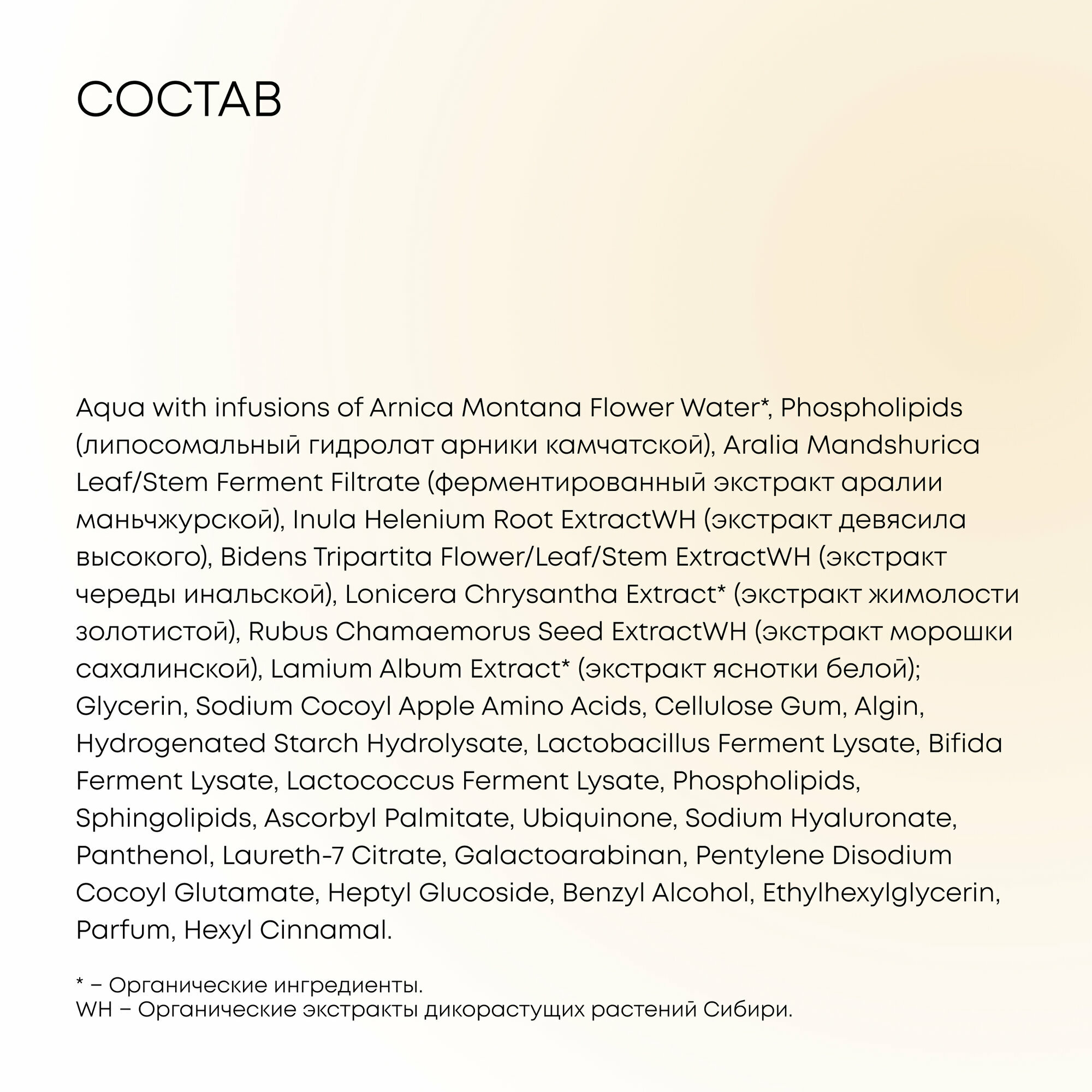 | Состав | Aqua with infusions of Arnica Montana Flower Water*, Phospholipids (липосомальный гидролат арники камчатской), Aralia Mandshurica Leaf/Stem Ferment Filtrate (ферментированный экстракт аралии маньчжурской), Inula Helenium Root ExtractWH (экстракт девясила высокого), Bidens Tripartita Flower/Leaf/Stem ExtractWH (экстракт череды инальской), Lonicera Chrysantha Extract* (экстракт жимолости золотистой), Rubus Chamaemorus Seed ExtractWH (экстракт морошки сахалинской), Lamium Album Extract* (экстракт яснотки белой), Glycerin, Sodium Cocoyl Apple Amino Acids, Cellulose Gum, Algin, Hydrogenated Starch Hydrolysate, Lactobacillus Ferment Lysate, Bifida Ferment Lysate, Lactococcus Ferment Lysate, Phospholipids, Sphingolipids, Ascorbyl Palmitate, Ubiquinone, Sodium Hyaluronate, Panthenol, Laureth-7 Citrate, Galactoarabinan, Pentylene Disodium Cocoyl Glutamate, Heptyl Glucoside, Benzyl Alcohol, Ethylhexylglycerin, Parfum, Hexyl Cinnamal.* − Органические ингредиенты.WH − Органические экстракты дикорастущих растений Сибири. |