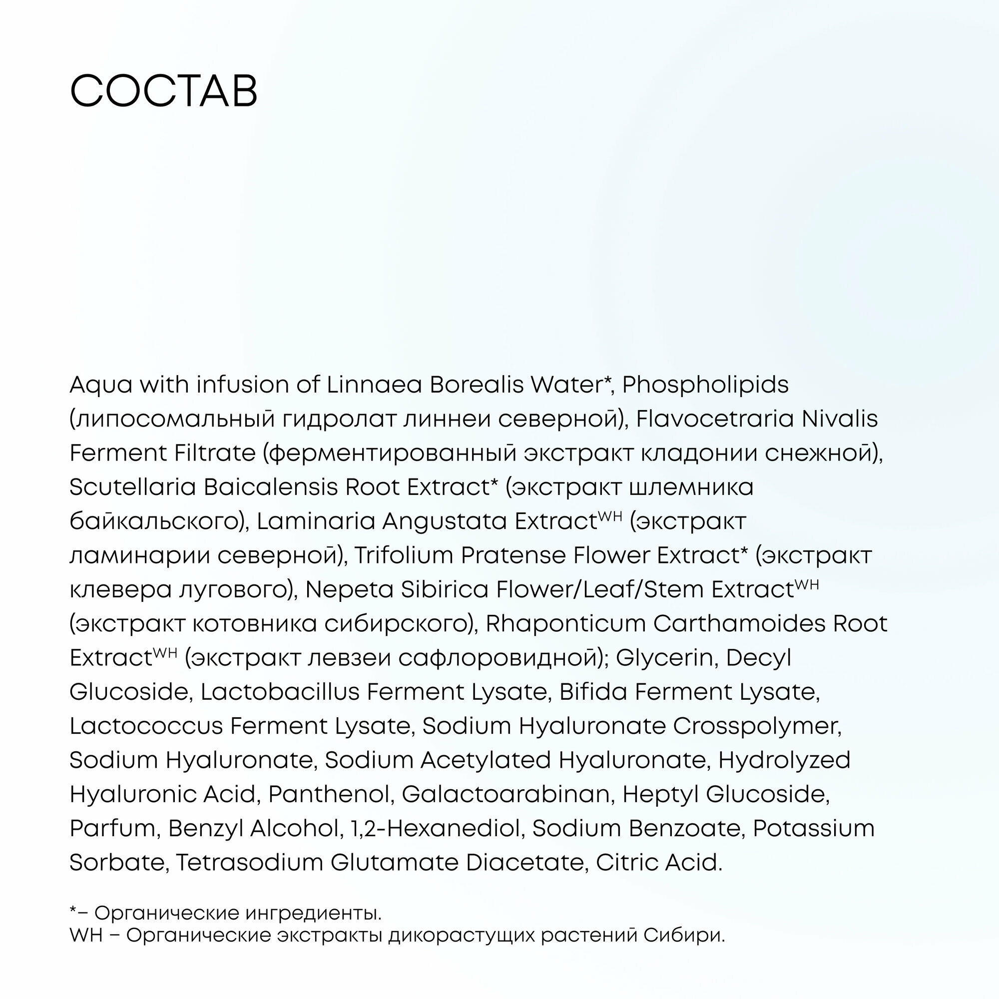 | Состав | Glycerin, Decyl Glucoside, Lactobacillus Ferment Lysate, Bifida Ferment Lysate, Lactococcus Ferment Lysate, Sodium Hyaluronate Crosspolymer, Sodium Hyaluronate, Sodium Acetylated Hyaluronate, Hydrolyzed Hyaluronic Acid, Panthenol, Galactoarabinan, Heptyl Glucoside, Parfum, Benzyl Alcohol, 1,2-Hexanediol, Sodium Benzoate, Potassium Sorbate, Tetrasodium Glutamate Diacetate, Citric Acid. − Органические ингредиенты. WH − Органические экстракты дикорастущих растений Сибири. |