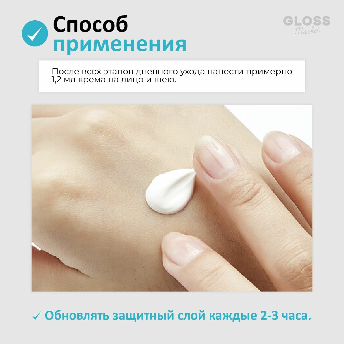 | Способ применения | После основного ухода за кожей, за 15-20 минут до выхода на солнце, нанесите средство на лицо и открытые участки тела мягкими движениями. Повторно применяйте солнцезащитный крем во время активного отдыха для более эффектной защиты. |