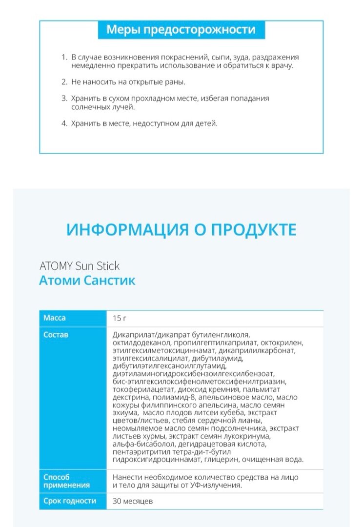 | Способ применения | Нанесите необходимое количество средства на лицо и тело после нанесения базового ухода. Носите стик с собой и используйте при необходимости. При использовании средства, выдвигайте стик на 5 мм. После использование задвиньте стик обратно и плотно закройте крышку. МЕРЫ ПРЕДОСТОРОЖНОСТИ: При появлении покраснений, зуда прекратите использование средства и обратитесь к врачу. Не наносите на раны. Не хранить при высокой или низкой температуре Не хранить при высокой температуре (30 ° и выше) или в закрытых помещениях (в машине). |