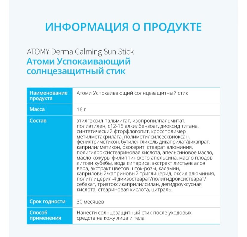 ATOMY / атоми Успокаивающий Солнцезащитный Стик для лица