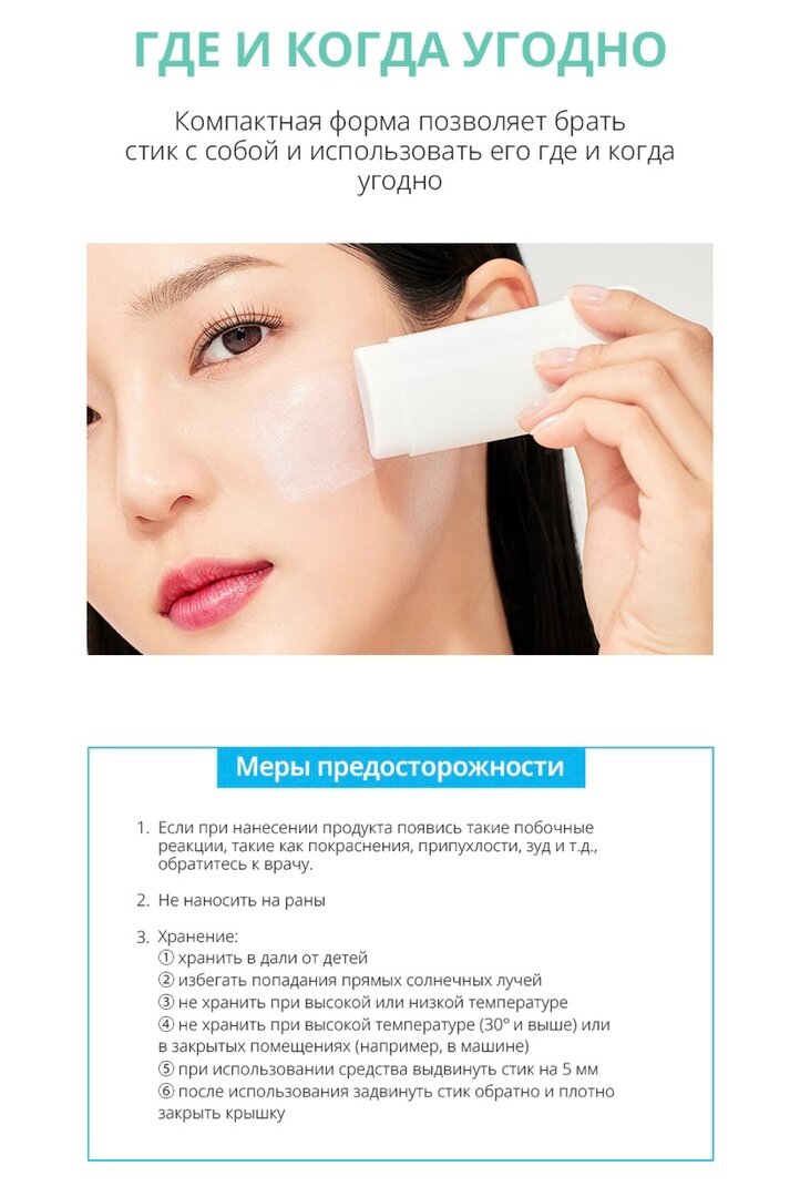 | Способ применения | Нанесите необходимое количество средства на лицо и тело после нанесения базового ухода. Носите стик с собой и используйте при необходимости. При использовании средства, выдвигайте стик на 5 мм. После использование задвиньте стик обратно и плотно закройте крышку. МЕРЫ ПРЕДОСТОРОЖНОСТИ: При появлении покраснений, зуда прекратите использование средства и обратитесь к врачу. Не наносите на раны. Не хранить при высокой или низкой температуре Не хранить при высокой температуре (30 ° и выше) или в закрытых помещениях (в машине). |