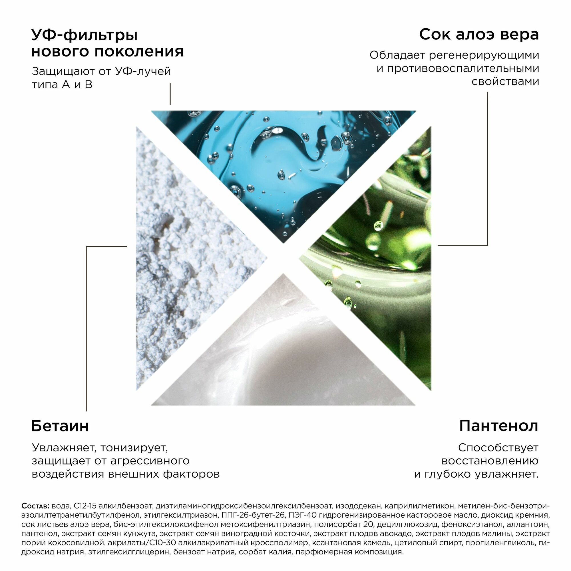 | Состав | Вода, диэтиламино гидроксибензоил гексил бензоат, этилгексил триазон, этилгексил метоксициннамат, глицерил стеарат, изододекан, C12-15 алкил бензоат, циклопентасилоксан, октокрилен, полисорбат 20, глицерин, диметикон, каприловый/каприновый триглицерид, изопропил пальмитат, этилгексил салицилат, бутил метоксидибензоилметан, алюминий, силика, бетаин, полиакрилоилдиметил таурат аммония, феноксиэтанол, пантенол, сок листьев алоэ вера, экстракт листьев гамамелиса, цетеарет-20, цетеарет-12, цетеариловый спирт, цетилпальмитат, ксантановая камедь, динатрий ЭДТА, пропиленгликоль, бензофенон-3, этилгексилглицерин, сорбат калия, бензоат натрия, отдушка. |