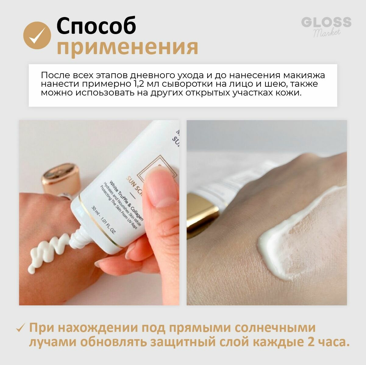 | Способ применения | после основного ухода за кожей нанесите средство на кожу аккуратными, мягкими движениями. Повторно применяйте солнцезащитный крем во время активного отдыха для более эффектной защиты |