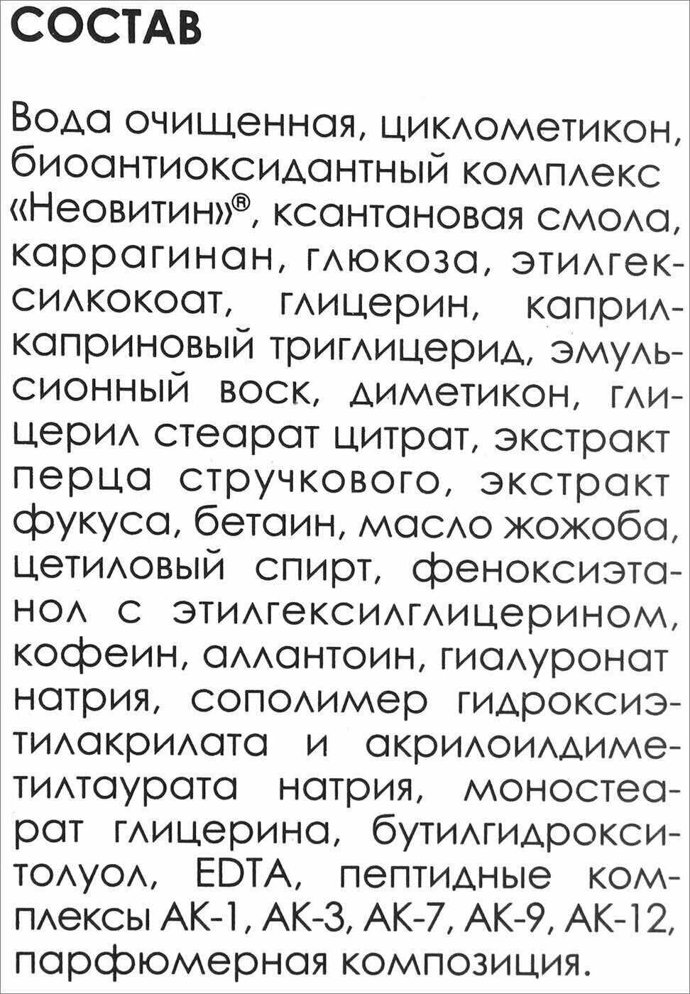 | Состав | вода очищенная, циклометикон, биоантиоксидантный комплекс «Неовитин»®, ксантановая смола, каррагинан, глюкоза, этилгексилкокоат, глицерин, каприлкаприновый триглицерид, эмульсионный воск, диметикон, глицерил стеарат цитрат, экстракт перца стручкового, экстракт фукуса, бетаин, масло жожоба, цетиловый спирт, феноксиэтанол с этилгексилглицерином, кофеин, аллантоин, гиалуронат натрия, сополимер гидроксиэтилакрилата и акрилоилдиметилтаурата натрия, моностеарат глицерина, бутилгидрокситолуол, EDTA, пептидные комплексы АК-1, АК-3, АК-7, АК-9, АК-12, парфюмерная композиция. |