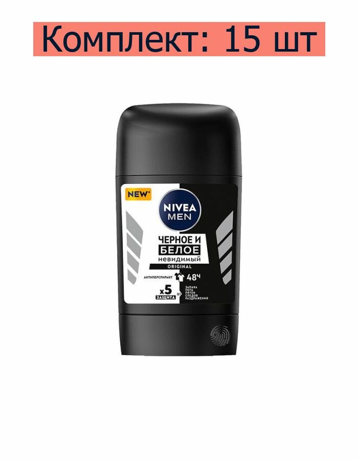 Купить Дезодорантантиперспирант Nivea Men, Черное и Белое, Невидимый, стик, 50 мл, 15 шт.