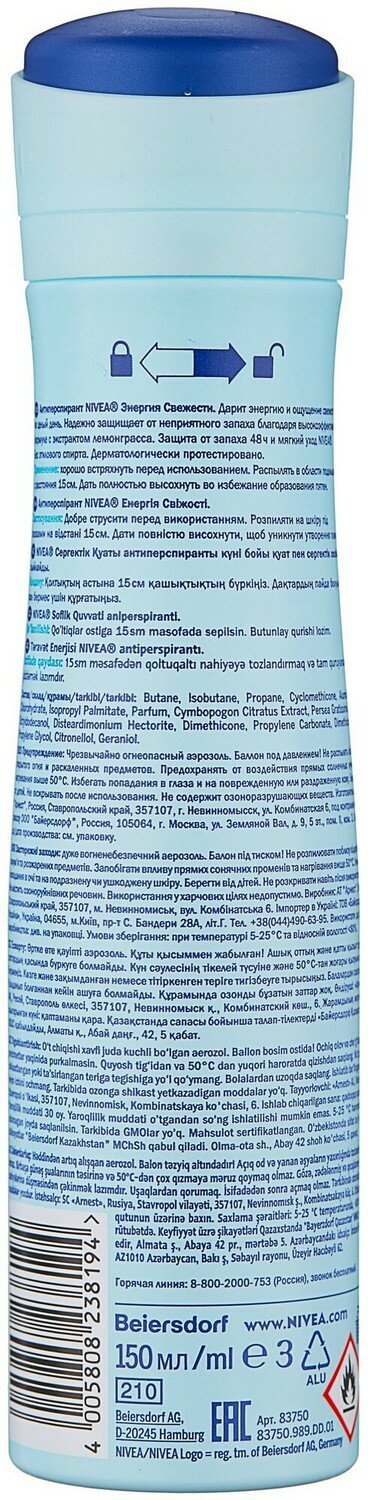 Дезодорант-антиперспирант Nivea, Энергия свежести с экстрактом лемонграсса, 150 мл, 3 шт
