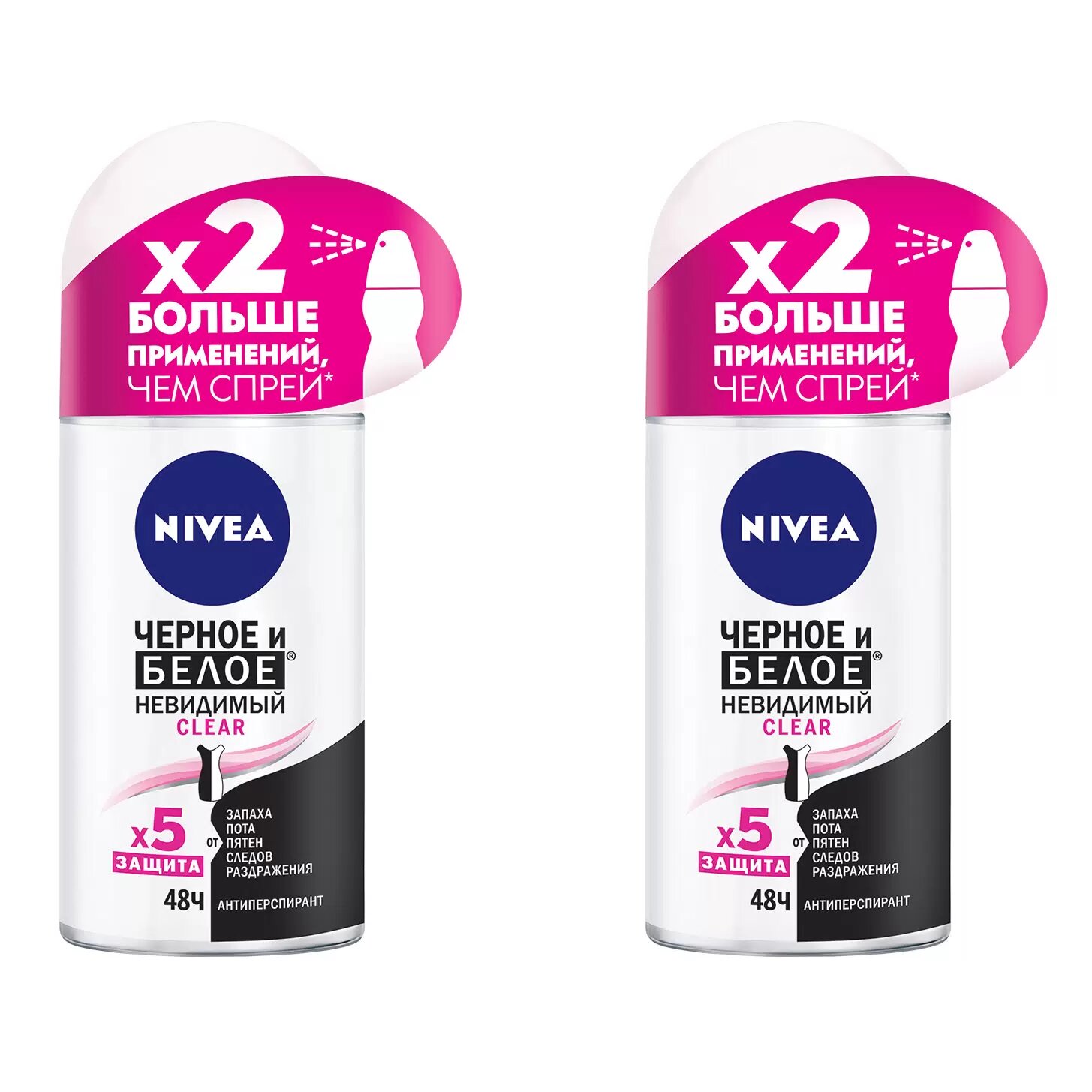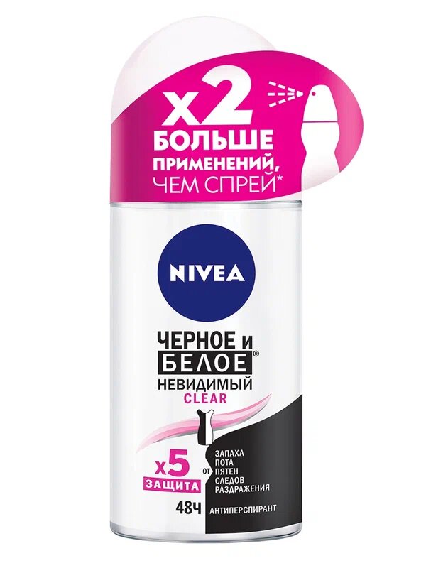 Купить Дезодорант-антиперспирант шариковый NIVEA "Черное и Белое" Невидимый Clear, 50 мл. 2шт