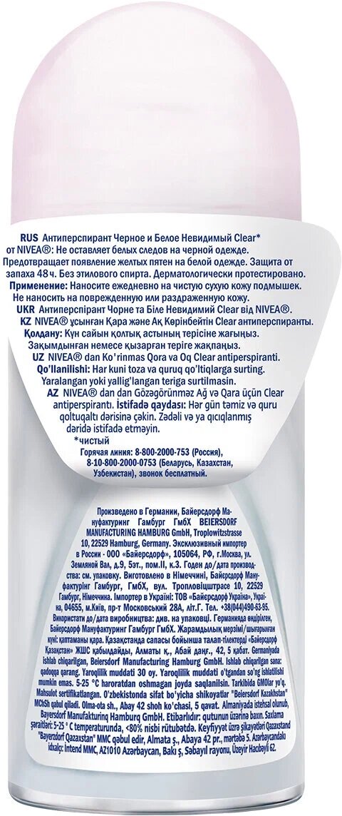 | Дополнительная информация | *Clear - Прозрачный **В 1,9 раз при сравнении дезодоранта спрея (150 мл) и шарикового дезодоранта (50 мл)при нанесении на область подмышек. Расход определен исследованием, проведенным в рамках Европейской Косметической Ассоциации COLIPA в 2004-2005 гг |