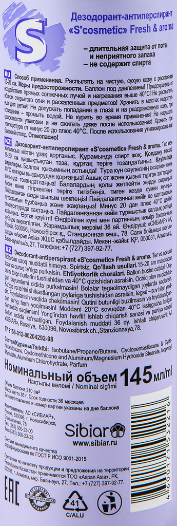 Дезодорант-антиперспирант S'Cosmetic женский, Fresh & Aroma 145 мл интересное: