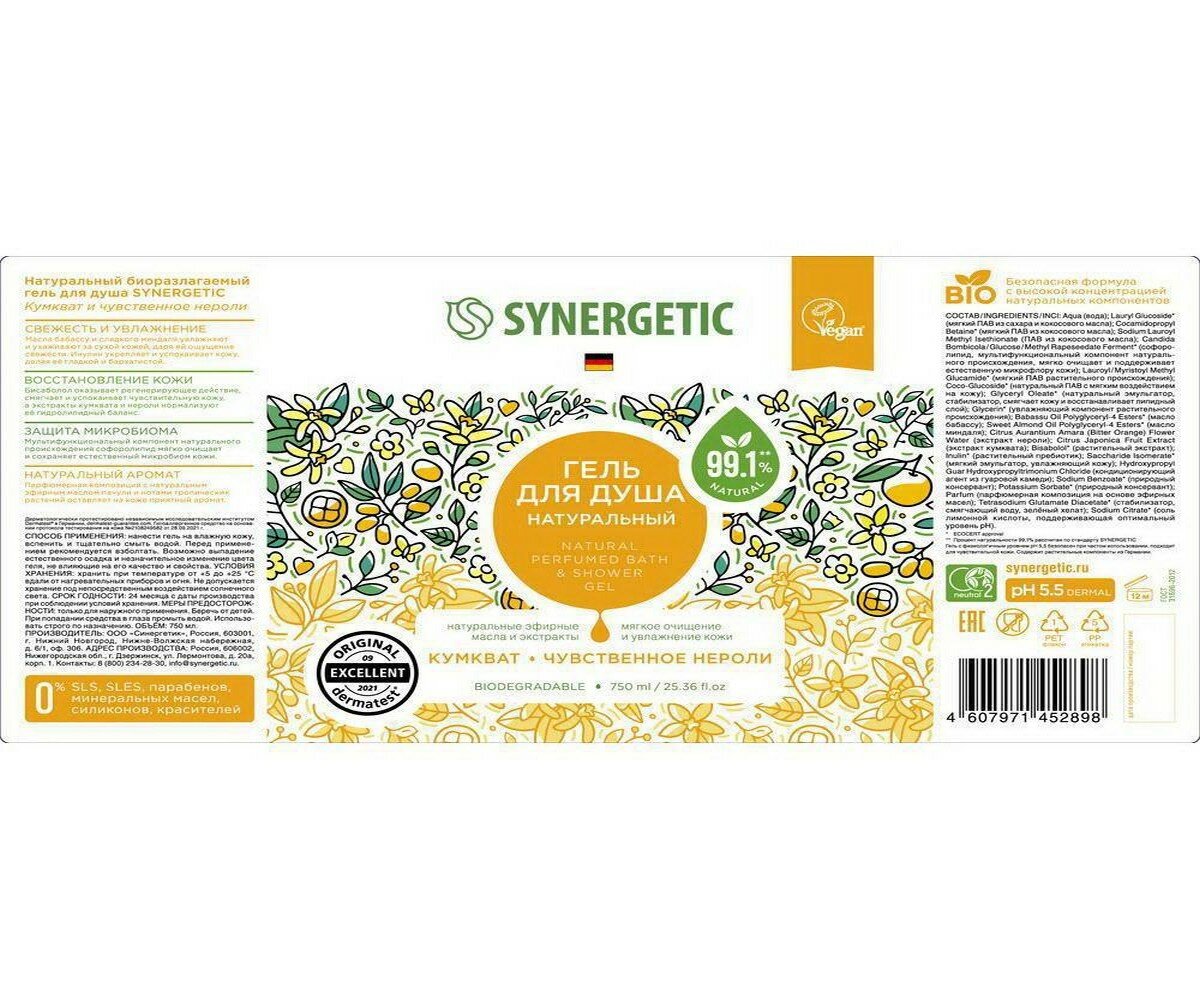 SYNERGETIC Гель для душа "Кумкват и чувственное нероли" увлажняющий, натуральный, 380мл