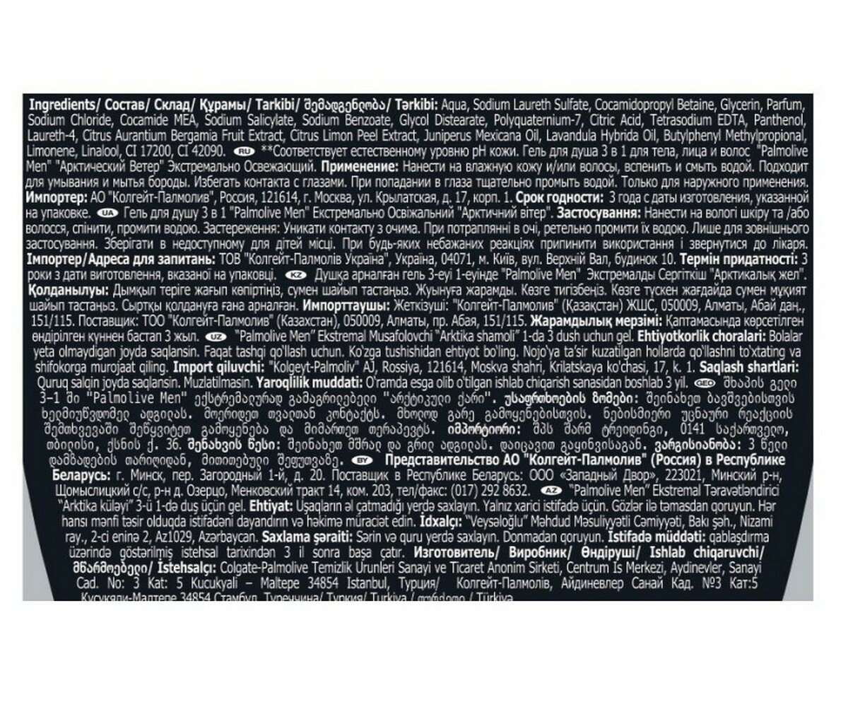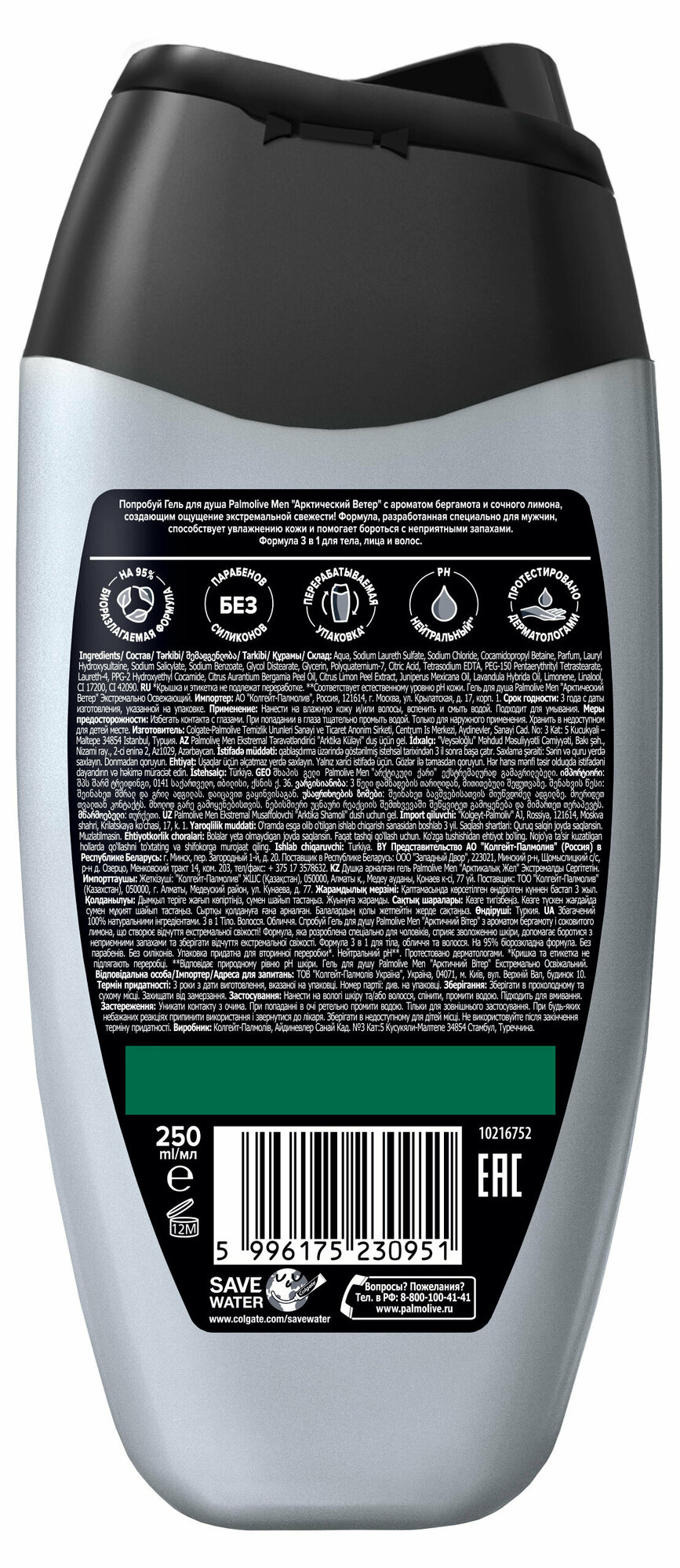 Гель для душа 3 в 1 для лица, волос и тела 250 мл, PALMOLIVE MEN "Арктический ветер", освежающий, 5996175230951, 1шт в компл.