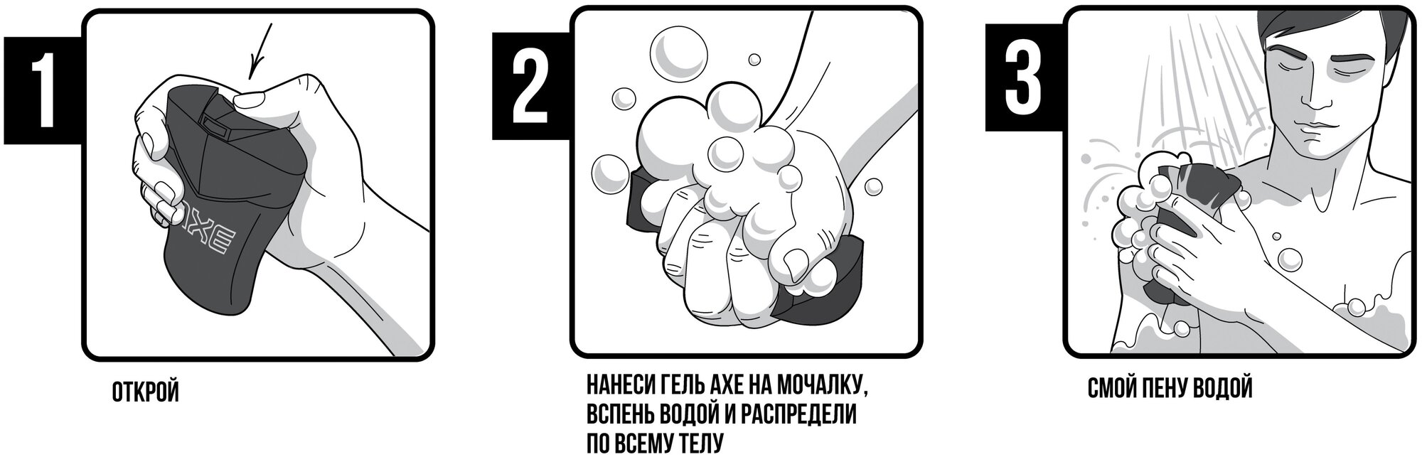 | Способ применения | нанести гель AXE на мочалку, слегка вспенить водой и распределить по всему телу, после чего смыть пену водой. Можно использовать его как шампунь. Избегать попадания в глаза, при попадании тщательно промыть их водой |