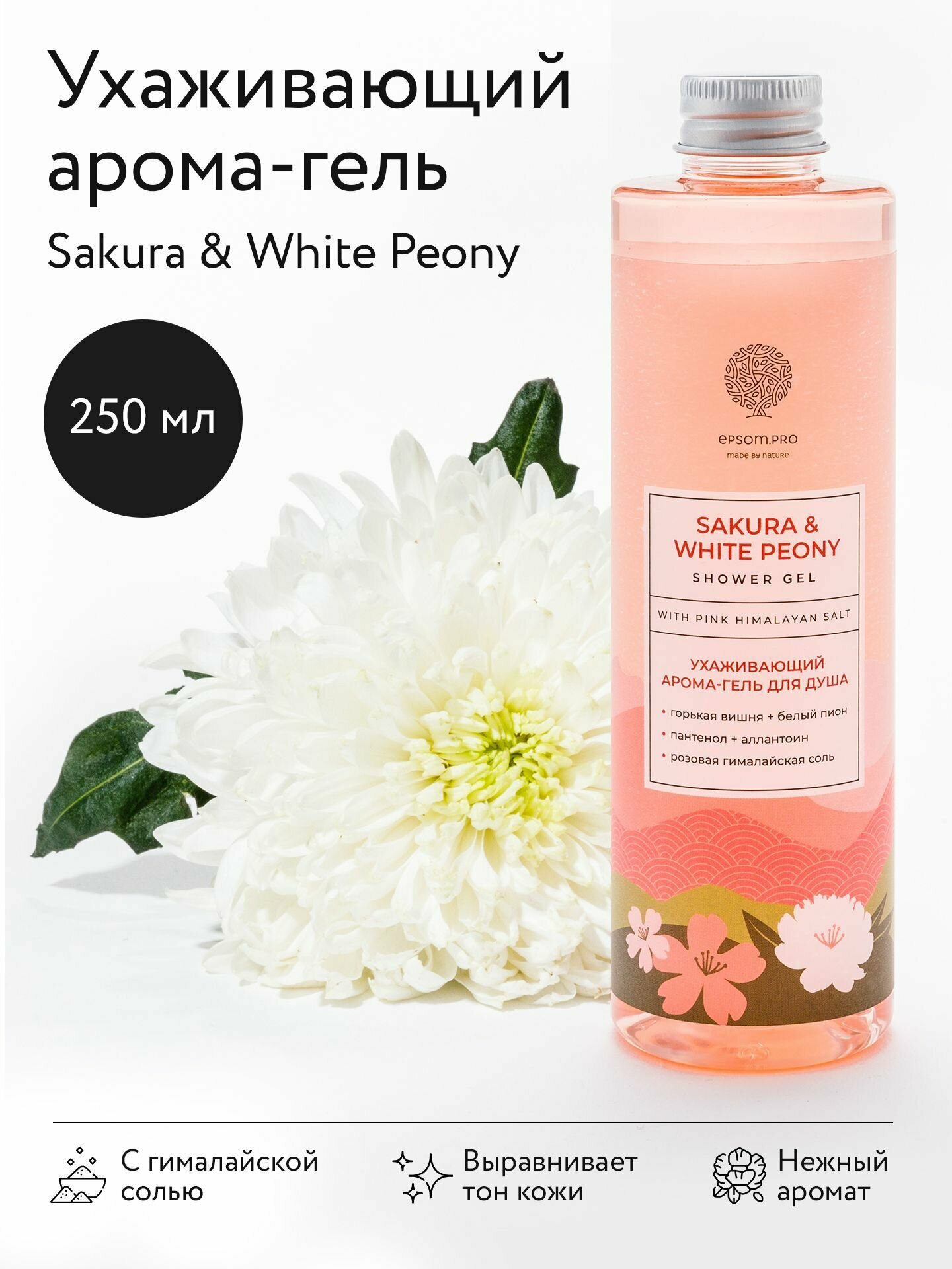 Купить Ухаживающий арома-гель для душа SAKURA & WHITE PEONY с розовой гималайской солью 250мл