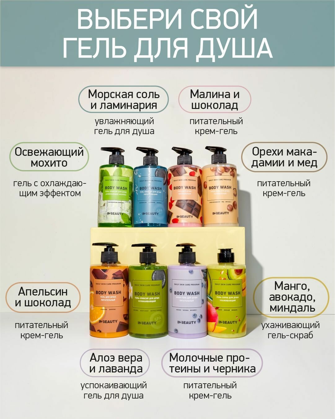 IN2BEAUTY/ крем гель для душа питательный С маслом макадамии, с витаминами Е, с мёдом, увлажняющий, с дозатором, 460мл