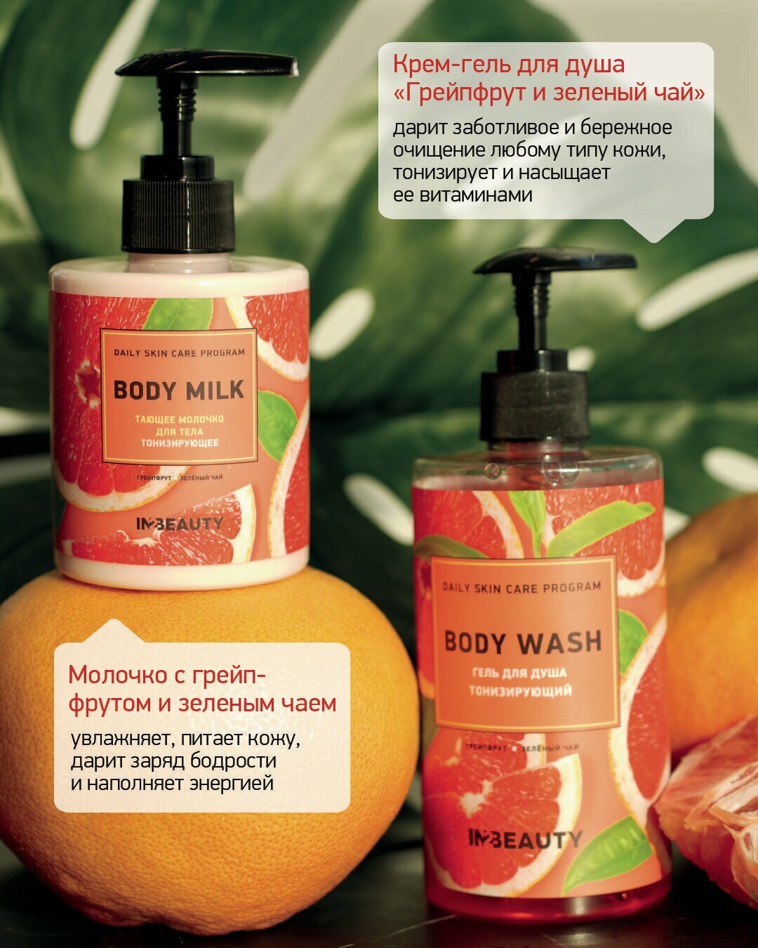 Купить IN2BEAUTY/ гель для душа тонизирующий с маслами Грейпфрут и зелёным чаем + молочко для тела с маслами грейпфрута и витамином C, с дозатором